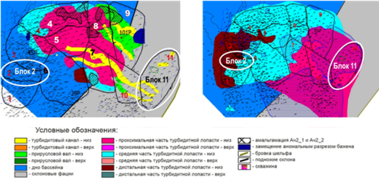 Фациальное строение востока и запада объекта Ач сильно различается. Западная часть (турбидитовая лопасть) характеризуется относительной однородностью свойств. Здесь не выделено зон с улучшенными фильтрационными свойствами благодаря турбидитовым каналам или естественной трещиноватости. Соответственно, и работа скважин в этих частях очень разная.