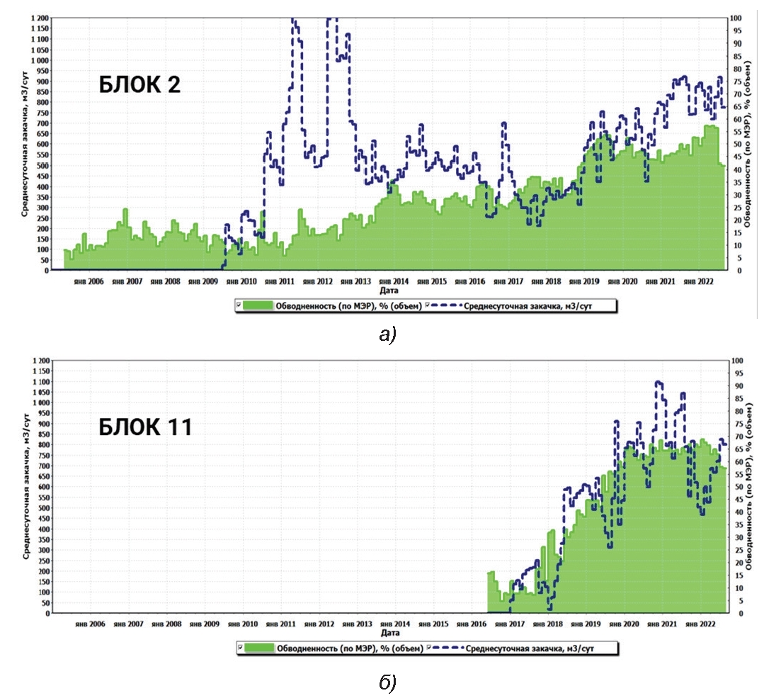 а) обводнённость / water cut; б) среднесуточная закачка / daily average injection
