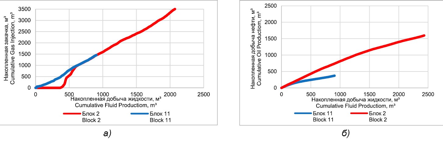 а) накопленная добыча нефти / cumulative oil production; б) накопленная закачка / accumulated injection