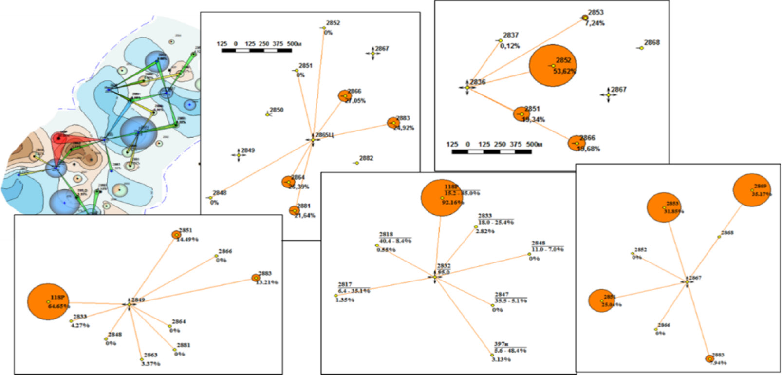 Результаты трассерных исследований показывают, что нет выдержанного направления реакции нагнетательных скважин на добывающие. Добывающие скважины с наибольшим выходом индикатора расположены не по стрессу, а в случайных направлениях от ППД (рис. 20). Это может указывать на влияние нагнетательных скважин на добывающие через АРБ.