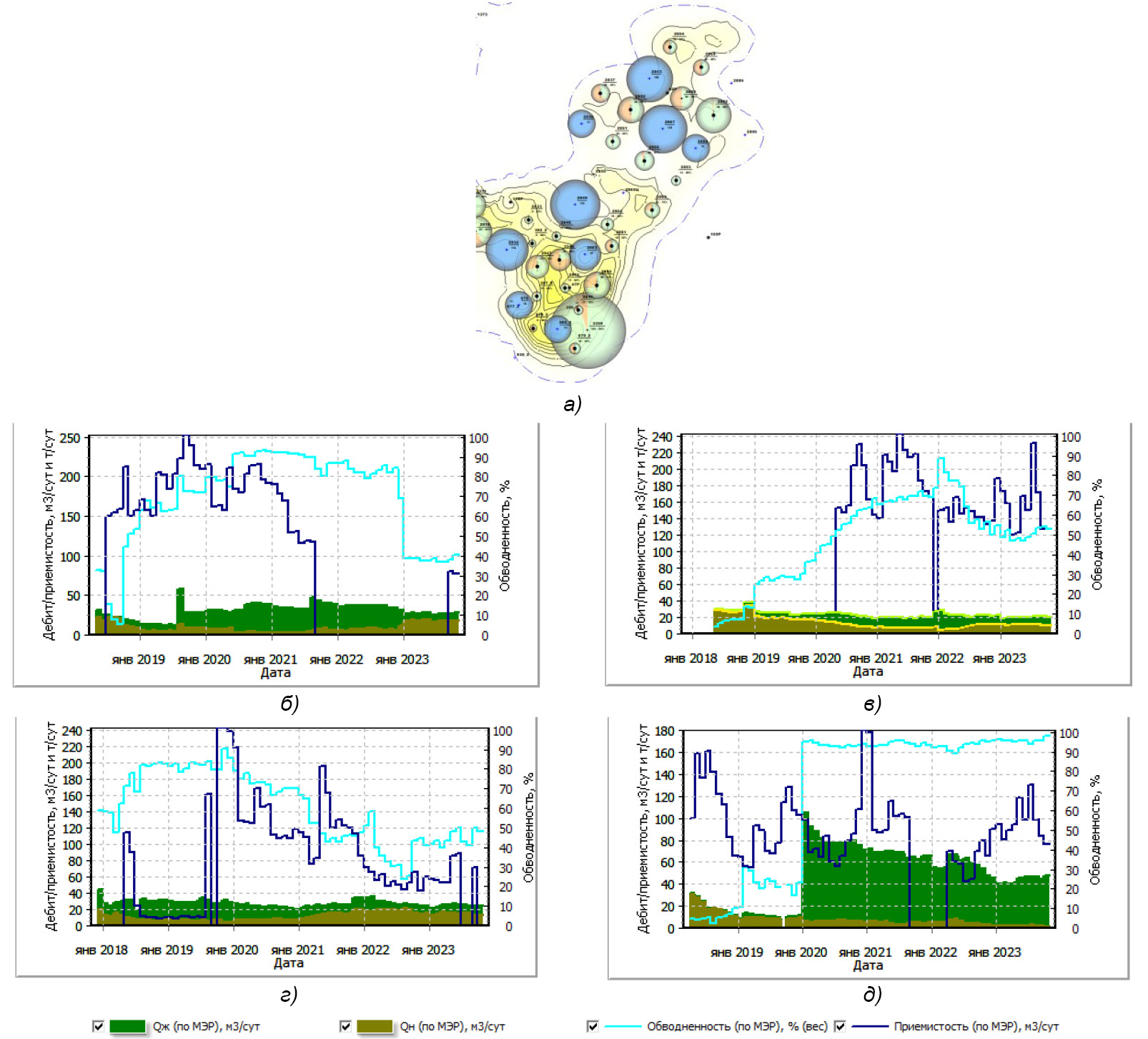 а) карта текущих отборов пласта Ач восточного участка / Chart of current production of the Ach formation in the eastern site; б) графики работы скв. 2837–2836 / schedules of performance of wells 2837–2836; в) графики работы скважин 2853–2854 / schedules of performance of wells 2853–2854; г) графики работы скважин 2869–2886 / schedules of performance of wells 2869–2886; д) графики работы скважин 2885–2884 / schedules of performance of wells 2885–2884