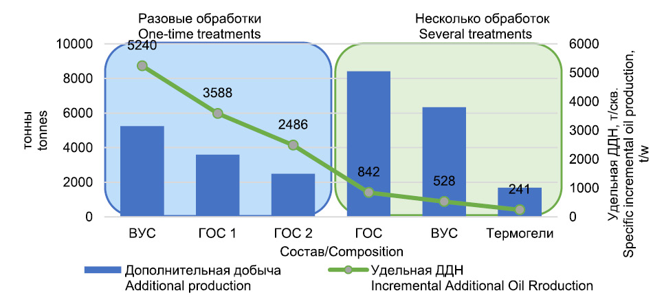 ФХМУН – физико-химические методы увеличения нефтеотдачи / physical and chemical methods of increasing oil recovery; ДД – дополнительная добыча / additional recovery; ДДН – дополнительная добыча нефти / incremental oil production; ВУС – вязкоупругий состав /hi-vis pill; ГОС – гелеобразующий состав / gellant gelling agent