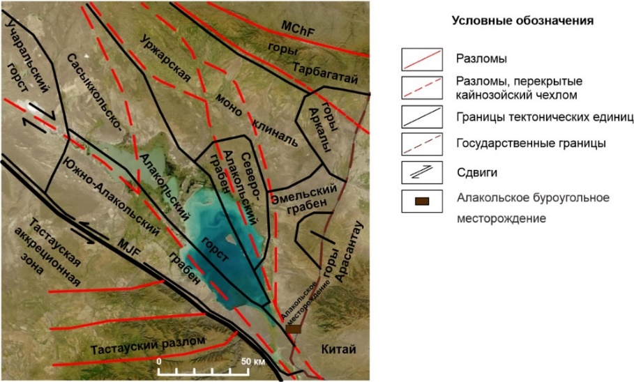 Алакольский бассейн (далее – АБ) расположен на юго-востоке казахстанского сегмента герцинской Джунгаро-Балхашской складчатой системы [1–5]. По периферии АБ ограничен Главными Джунгарским (далее – ГДР) и Чингизским (далее – ГЧР) региональными разломами (рис. 1,2). АБ является северо-западным окончанием Джунгарского нефтегазоносного бассейна Китая [3, 6–8]. АБ со всех сторон ограничен горными хребтами, сложенными преимущественно палеозойскими (от кембрийских до пермских), офиолитовыми, островодужными и аккреционными комплексами пород. Главными тектоническими элементами герцинской Джунгаро-Балхашской складчатой системы являются тектонические блоки, ограниченные разломами. Они состоят из фрагментов протерозойской континентальной коры и неопротерозойско-палеозойских субдукционно-ак- креционных комплексов, зачастую перекрытых мезозойскими осадочными образованиями (рис. 1–3) [3–24].