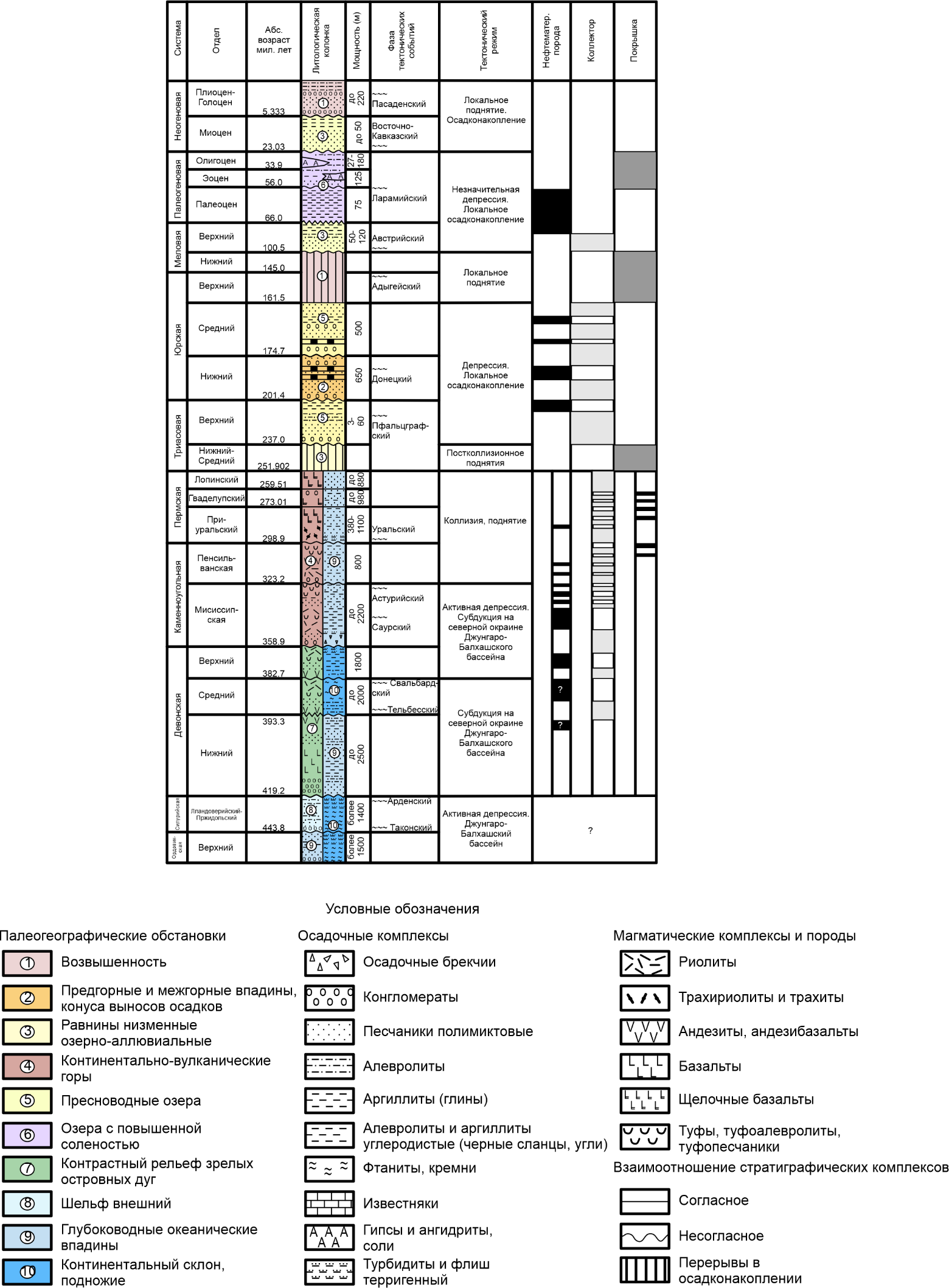 АБ, образованный вследствие опускания в позднем палеозое – мезозое (рис. 3–5) блока земной коры по крупноамплитудным сбросо-сдвигам Главного Джунгарского и Чингизского разломов, характеризуется слабой вертикальной кинетикой с неглубоким залеганием фундамента. Наиболее глубокие Южно- и Северо-Алакольские прогибы заполнены верхнепалеозойскими терригенными отложениями (рис. 3, 5).