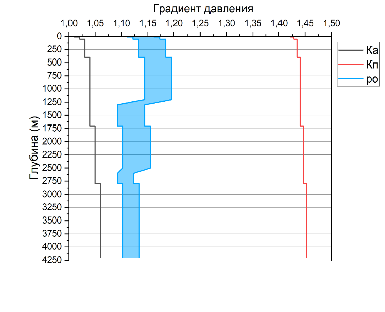 Для проектирования конструкции скважины рекомендуется использование метода построения совмещённого графика изменения коэффициента аномальности пластовых давлений (Ka), индекса давления поглощения (Kn) и относительной плотности промывочной жидкости (ρo) в зависимости от глубины (z).