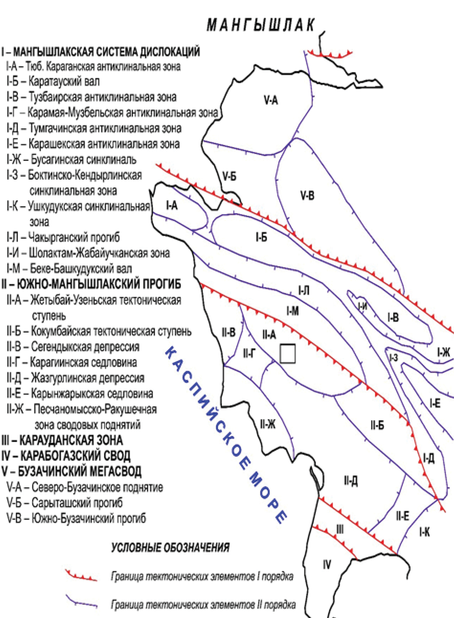 Жетыбай-Узеньская тектоническая ступень является структурным элементом второго порядка, приурочена к северной бортовой части Южно-Мангышлакского прогиба и протягивается с северо-запада на юго-восток на 200 км при ширине ступени около 40 км. С севера ступень ограничена региональным разломом, осложняющим южное крыло Беке-Башкудукского вала, на западе граничит с Сегендыкской депрессией и Карагиинской седловиной, а на востоке – с Кокумбайской ступенью. От Жазгурлинской депрессии на юге ступень отделена глубинным разломом субширотного простирания, отраженном в платформенном чехле флексурообразным перегибом. Строение Жетыбай-Узеньской тектонической ступени характеризуется отчётливой линейностью структур, выражающейся в приуроченности локальных поднятий к антиклинальным линиям, ориентированным согласно простиранию всей ступени с востока / юго-востока на запад / северо-запад. С севера на юг в пределах ступени выделяются Узень- Карамандыбасская, Жетыбайская и ТенгеТасбулатская антиклинальные линии, к последней из которых приурочена Жетыбайская структура (рис. 1–2). Одной из крупных локальных структур Жетыбай-Узеньской ступени является Жетыбайское поднятие, представляющее собой пологую антиклинальную складку, ось которой простирается с востока / юго-востока на запад / северо-запад.