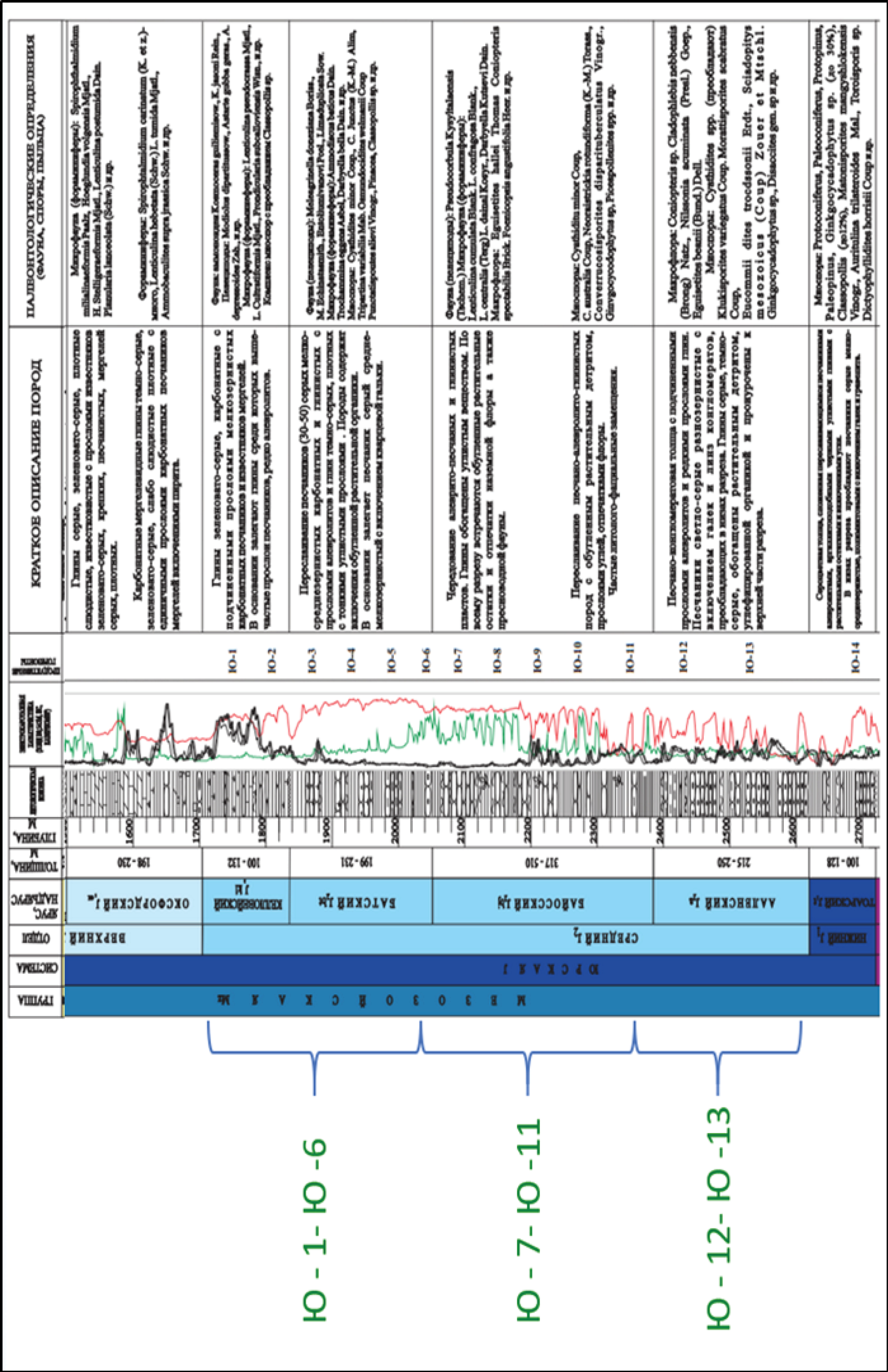 Анализ данных кернового материала позволил выделить литофации, которые свидетельствуют о характере отложений, формировавшихся в континентальных и прибрежно-морских условиях. Наблюдается постепенный переход от мелководья прибрежной зоны до равнин, временами заливавшихся морем, и приливно-отливных (проградация и ретроградация) условий осадконакопления при движении вверх по разрезу.