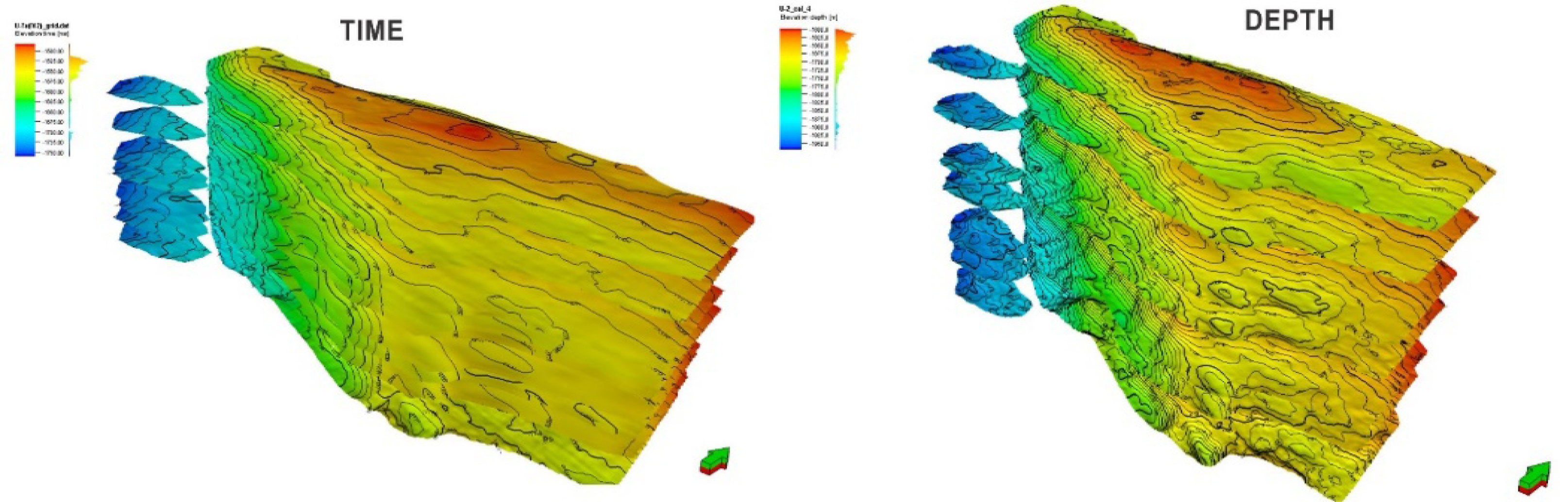 Для глубинных преобразований использовалась скоростная модель, основанная на вертикальных годографах, полученных в процессе увязки скважин с сейсмическими данными (рис. 4).
