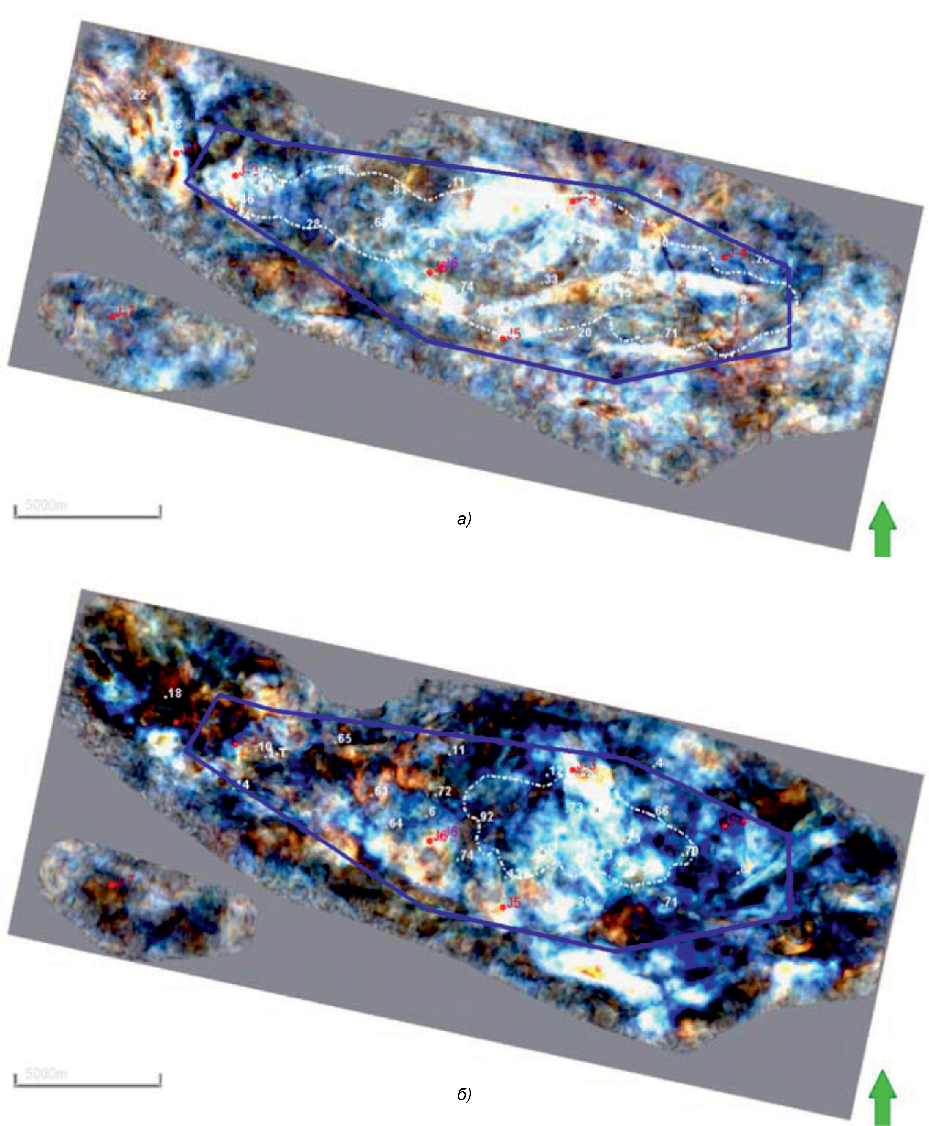 Детализация выявленных песчаных тел позволяет прогнозировать перспективные участки, не охваченные бурением в настоящее время. С целью уточнения перспективных объектов, выделенных как песчаное тело (палеорусло) по картам атрибутов, заложены оценочные скважины в пределах выделенных структурных поднятий и песчаных тел.