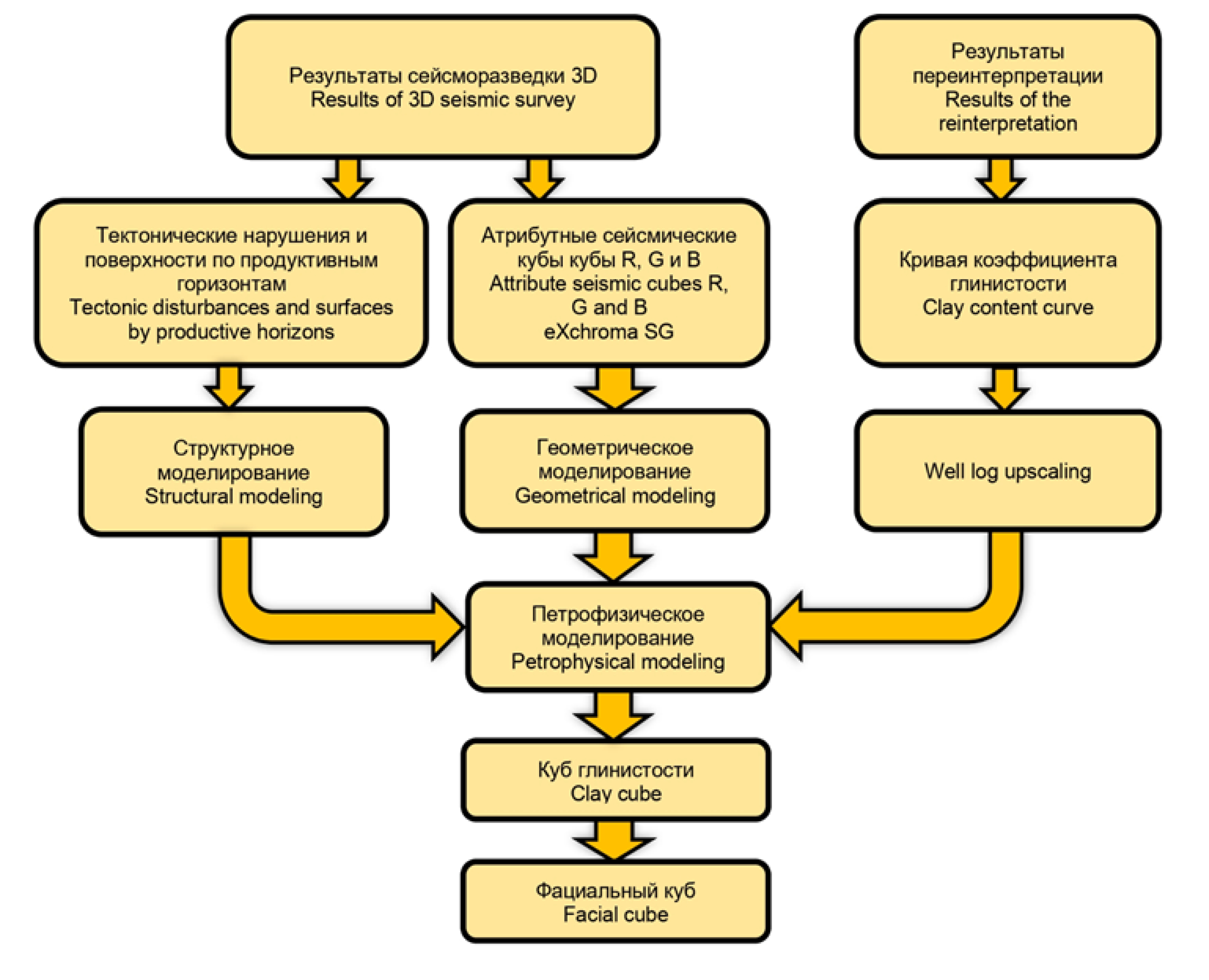 Для проведения полноценного анализа обстановок осадконакопления (фациального анализа) и построения фациальной модели на месторождении Жетыбай был проведен седиментологический анализ керна для корректной привязки фациальных обстановок со скважинными данными. На рис. 6 представлена схема построения сейсмофациального куба [4].
