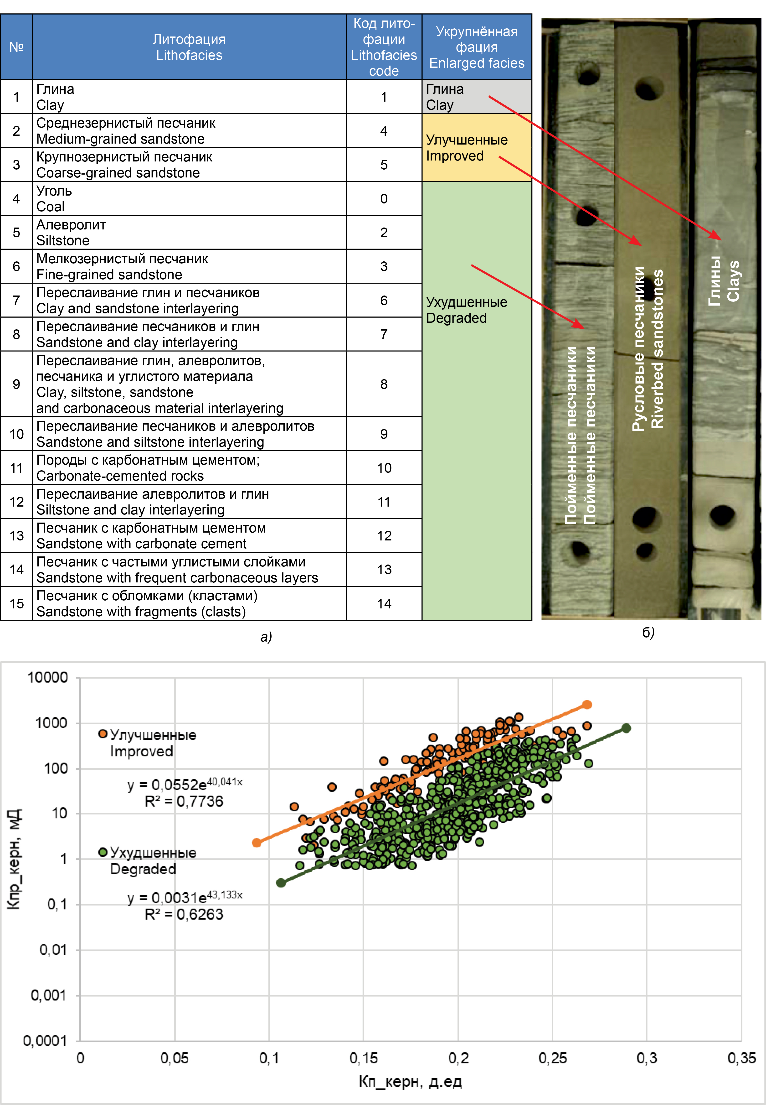 а) таблица литофации / lithofacies table; б) фрагмент снимков керна / fragment of core images; в) расчет зависимостей пористость / проницаемость по фациям / calculation of porosity / permeability relationships by facies