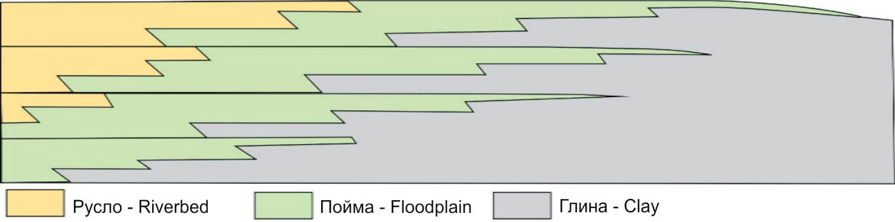 Для интерпретации исследований керна и качества пластов-коллекторов были приняты две фациальные схемы. Первая схема литофаций, является чисто описательной и позволяет классифицировать типы породы, используя структуру осадочной породы. Согласно проведенному детальному седиментологическому анализу керна и результатам макроописания пород, в первой схеме было выделено 15 литофаций с укрупнением на три фации: глина, русла и пойма.