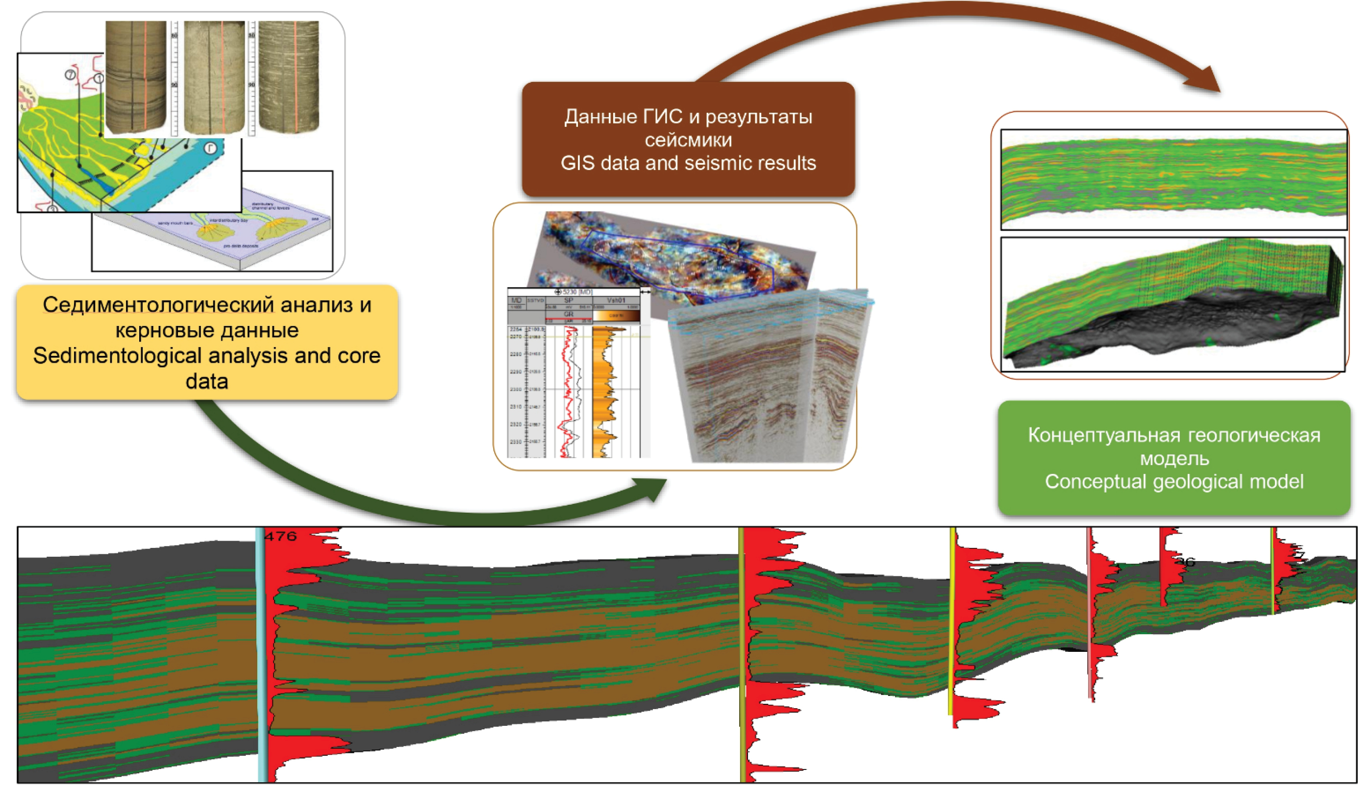 При определении условий осадконакопления использовались региональные данные, керновые материалы, результаты стандартных исследований образцов из керна, данные ГИС и результаты сейсморазведки (рис. 10).