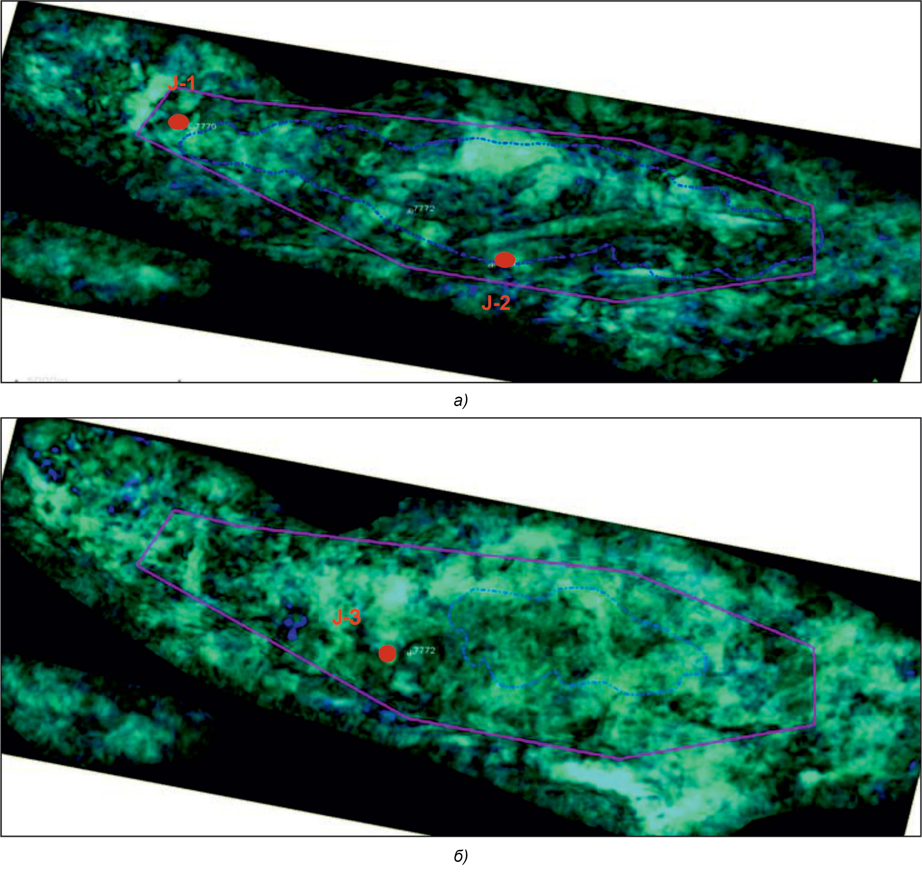 Основная цель оценочных скважин на краевых частях месторождения Жетыбай – поиски залежей углеводородов в перспективных юрских отложениях, изучение геологического строения поднятий, выявленных высокоразрешающими сейсморазведочными 3D-работами (далее – ВРС) МОГТ по отражающим горизонтам внутри юрских отложений [6]. По результатам заложены оценочные скважины J-1, J-2 и J-3. Предполагаемое расположение скважин намечено на рис. 11–13.