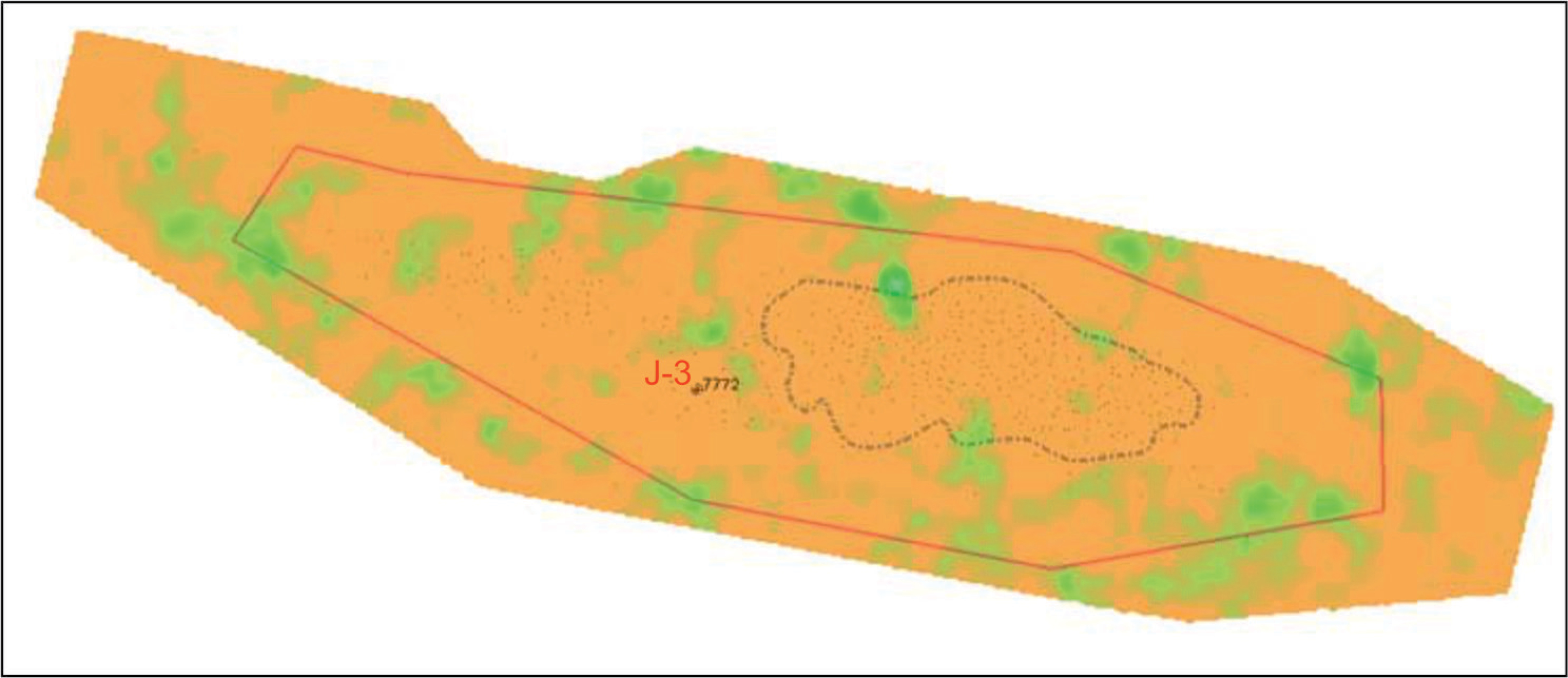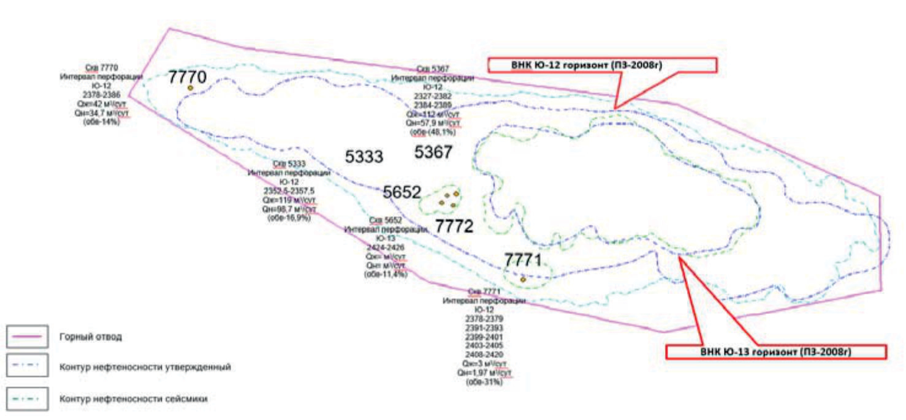 Оценочные скважины J-1, J-2 и J-3 пробурены в 2023–2024 гг. за утвержденным контуром нефтеносности горизонтов Ю-12 и Ю-13, а также эксплуатационные скважины 5333, 5652 и 5367 подтвердили продуктивность новой залежи.