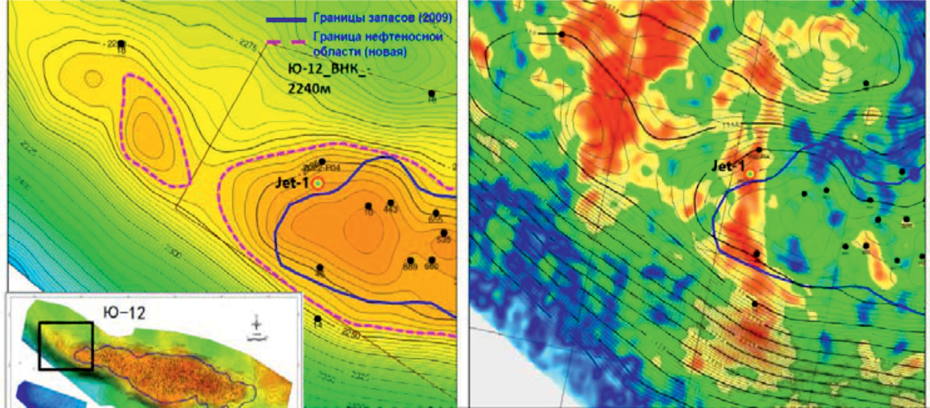 Рисунок 20. Результаты пробуренных скважин по сейсмическим данным, горизонты Ю-12 и Ю-13