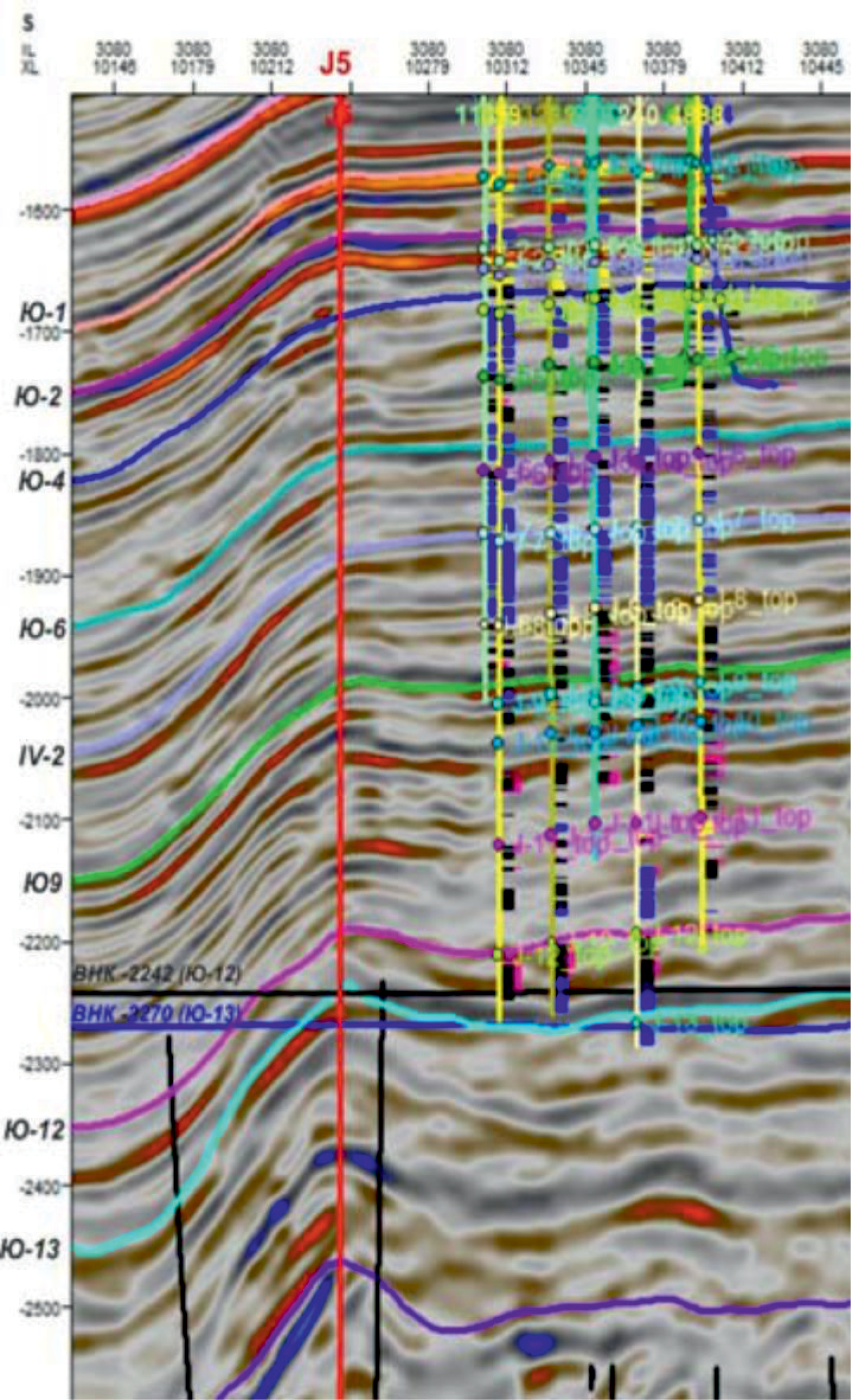 Рисунок 16. Глубинный сейсмический разрез через оценочную скважину J-1