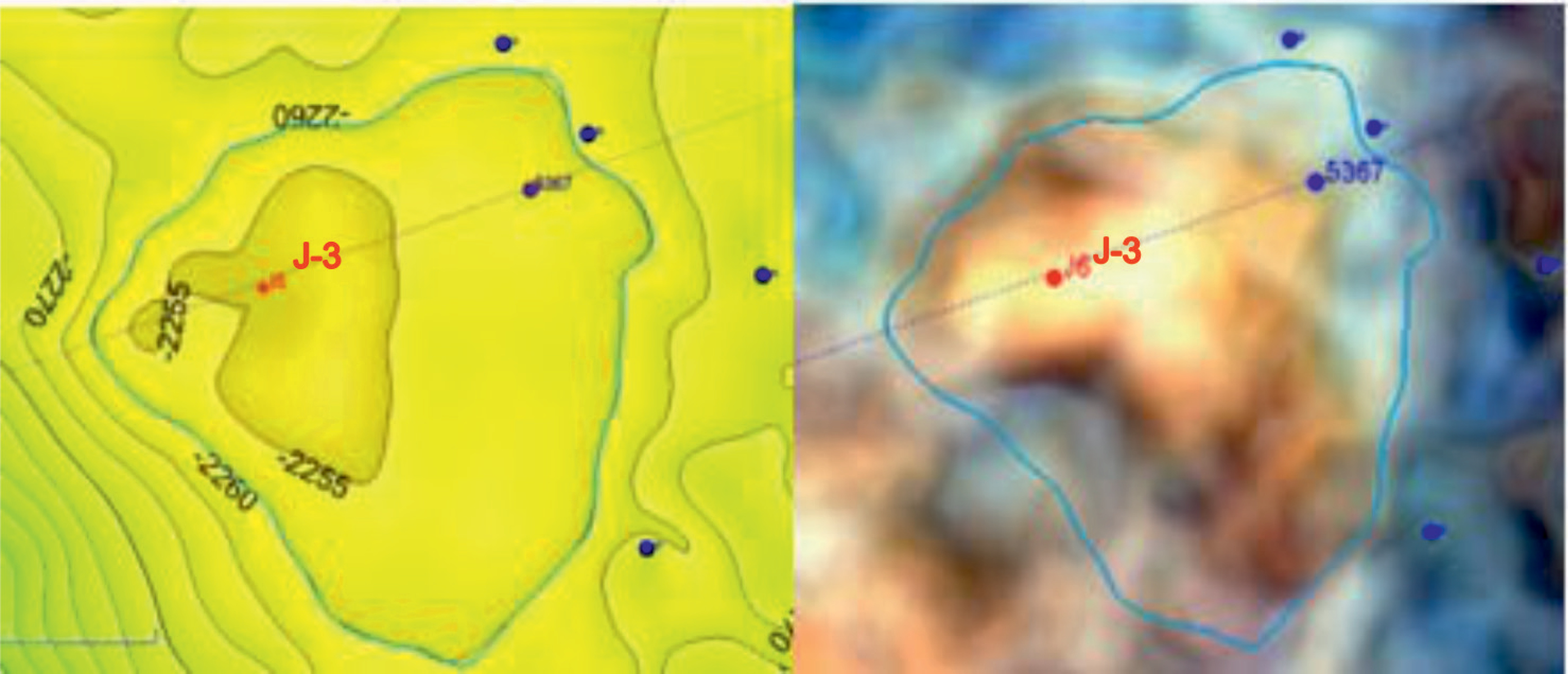 Скважина J-3 также пробурена согласно проектным данным и вскрыла нефтенасыщенные пласты-коллекторы горизонта Ю-13 с 100%-ным выносом керна. После освоения получен фонтан нефти.