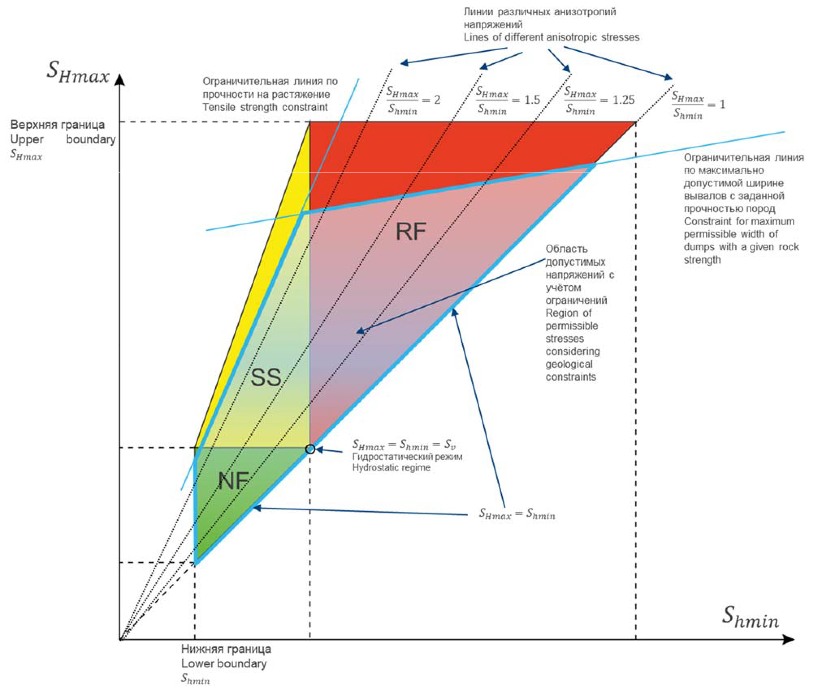 NF – область нормального режима напряжений / Normal Faulting; SS – область сдвигового режима напряжений / Strike-slip faulting; RF – область взбросового режима напряжений / Reverse Faulingt