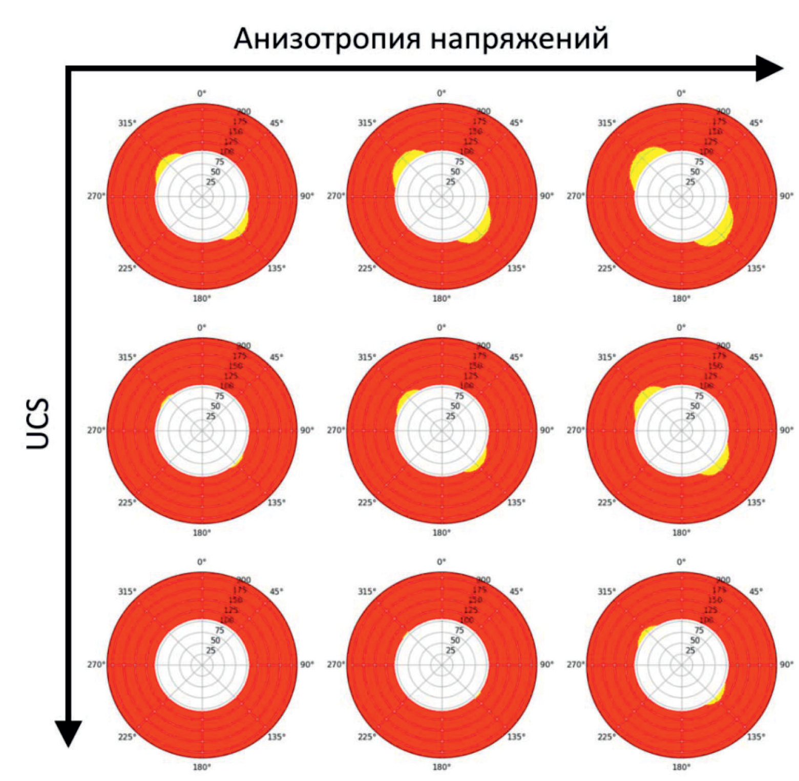 Вместо σ1 и σ3 в (19) подставляются, соответственно, наибольшее и наименьшее главное напряжение в околоскважинной зоне. Если условие (1) выполняется, то порода считается разрушенной, и образуется вывал (жёлтым цветом на рис. 3). Имея неопределённость по UCS, можно установить диапазон изменения этого параметра и задаться несколькими значениями для сравнения. В свою очередь, можно подобрать несколько вариантов анизотропии напряжения с ранее откалиброванным значением Shmin. Таким образом, можно найти подходящую комбинацию значений напряжений и прочности породы, откалибровавшись на показания многорычажного каверномера. Такой подход следует применить для нескольких сечений для лучшей адаптации модели.