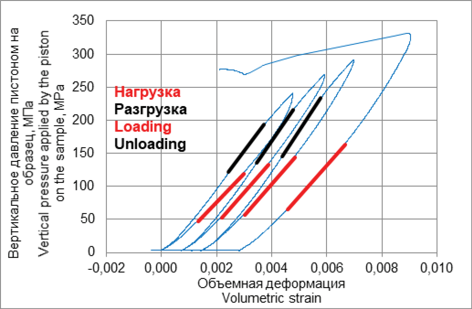 Использование корректных керновых данных не менее важно, поскольку при применении пороупругой модели напрямую учитываются значения упругих модулей. Более того, статический коэффициент Пуассона используется при расчёте модели устойчивости, а статический модуль Юнга может дополнительно включаться в процесс моделирования при учёте термических напряжений. Для корректного учёта статических упругих модулей необходимо включение в программу исследований керна многостадийных псевдотрёхосных тестов (рис. 4) Такие тесты разбиты на стадии, на каждой из которых поддерживается различное обжимное давление. Это, с одной стороны, позволяет протестировать образец в различных напряжённых состояниях при наличии неопределённостей в анизотропии, а с другой – сэкономить на количестве исследований при плохом качестве кернового материала или ограниченном бюджете на тестирование образцов. Среди особенностей проведения данных тестов присутствует возможность выполнения измерений на разгрузочной ветви графика «напряжение – относительная деформация». Именно на ветви разгрузки отсутствует пластическая деформация, поскольку она учитывается на ветви нагрузки в соответствующей стадии [6, 12]. Однако такие тесты не в полной мере подходят для построения паспортов прочности, поскольку деформация образца на различных стадиях доводится не до полного его разрушения, а до точки дилатансии, соответствующей максимуму объёмной деформации.