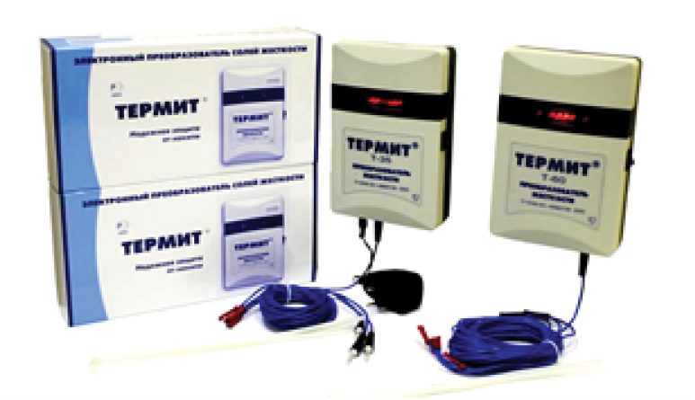 Для проведения данной работы был выбран прибор настенного типа – электронный преобразователь солей жёсткости «Термит» (рис. 1). Прибор «Термит» обрабатывает воду электромагнитными волнами, чем не только препятствует образованию накипи, но и удаляет накипь уже имеющуюся в оборудовании. Разработчиком является компания «Экосервис Технохим-М» (Россия).