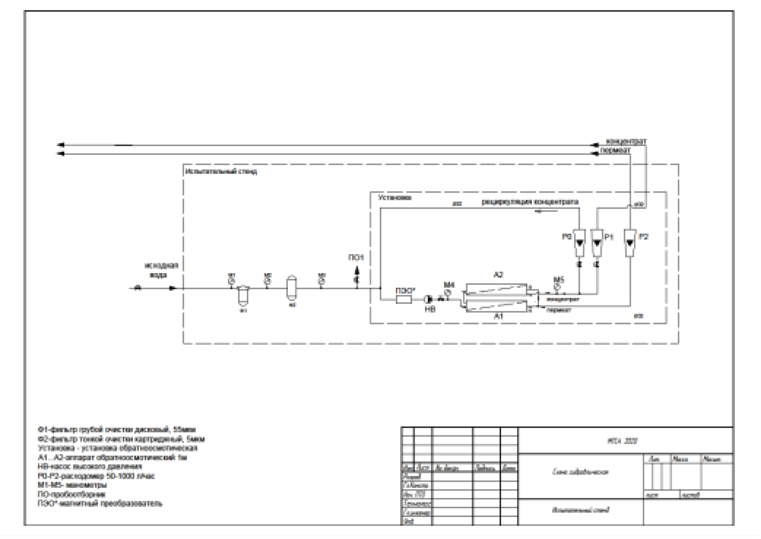 Описание технологической схемы пилотной установки следующее: исходная вода подаётся на механический фильтр Ф1 с порогом фильтрации 130 мкм, затем на фильтр тонкой очистки Ф2 с порогом фильтрации 5 мкм. Насосом высокого давления (далее – НВ) вода подаётся на два обратноосмотических аппарата А1 и А2. Перед НВ, после точки врезки рециркуляционной линии на трубопроводе устанавливается прибор электромагнитной обработки воды. Расходы концентрата, пермеата и рециркуляции концентрата контролируются по ротаметрам Р1, Р2, Р0 соответственно. Работа фильтров Ф1 и Ф2 контролируется по перепаду давления (манометры М1–М3). Работа элементов обратноосмотических аппаратов А1–А2 контролируется по ротаметрам Р1, Р2, Р0 и по перепаду давления на манометрах М4 и М5. Установка работает по проточной схеме, т.е. пермеат и рассол сбрасываются в канализацию.