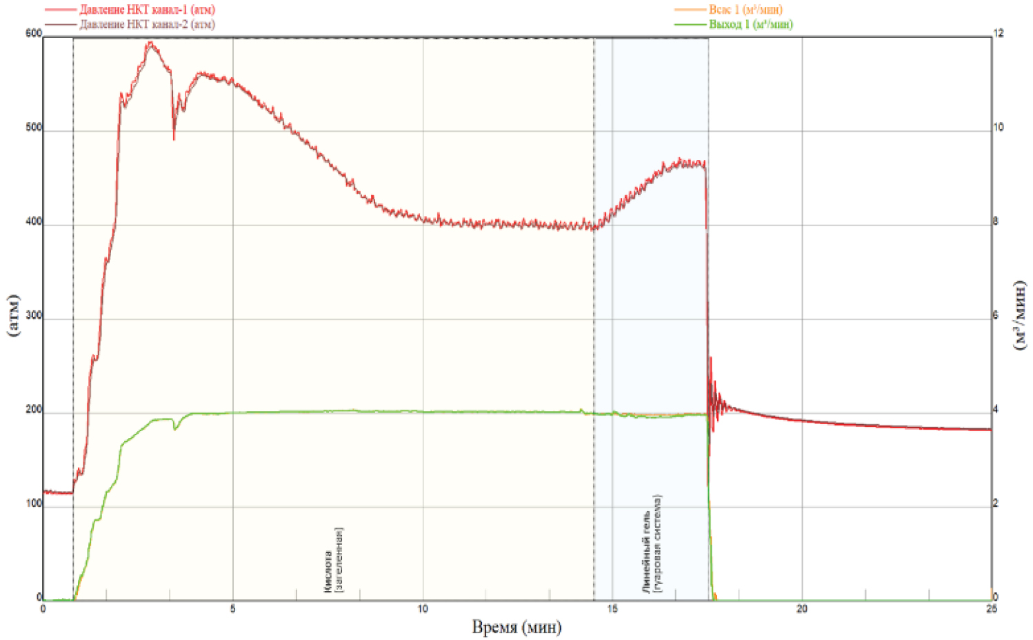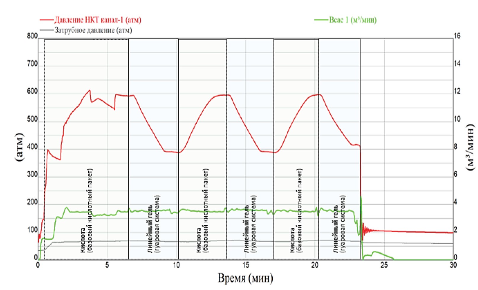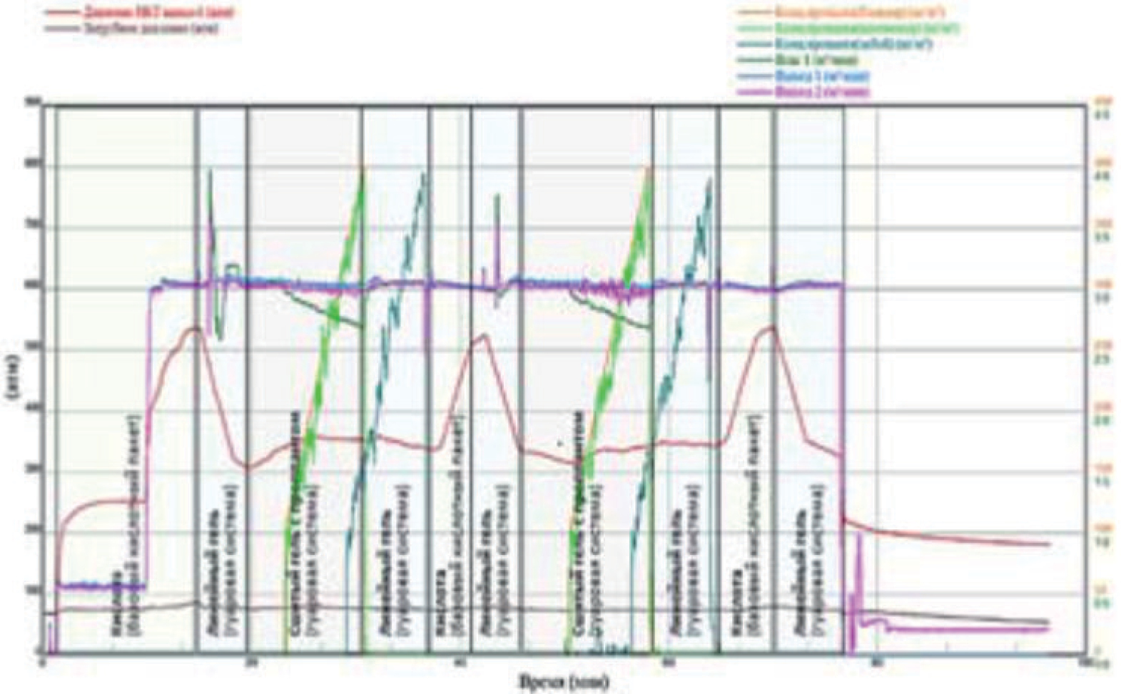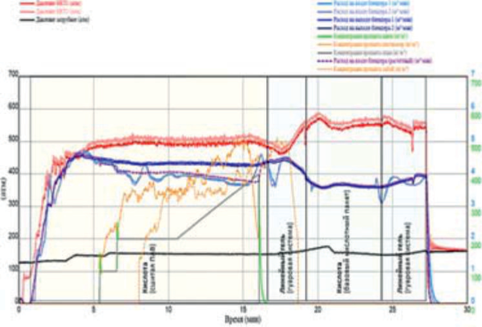 На рис. 3 приведен пример выполнения кГРП на одном из объектов Группы с температурой пласта ≈120°С. Стоит обратить особое внимание на то, что в работе используется не только охлаждающая пачка («пребуфер»), но и различные варианты кислотных составов для увеличения площади травления и достижения лучшего эффекта от стимуляции.