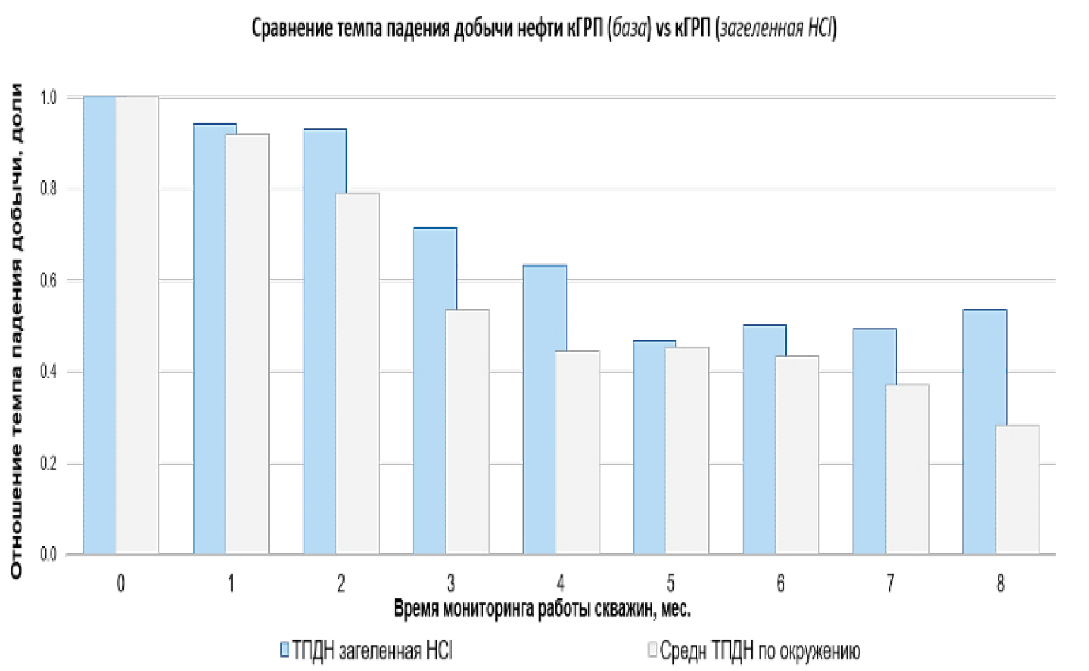 Рисунок 7. Сравнение темпа падения добычи нефти кГРП (база) и кГРП (загеленная HCl)
