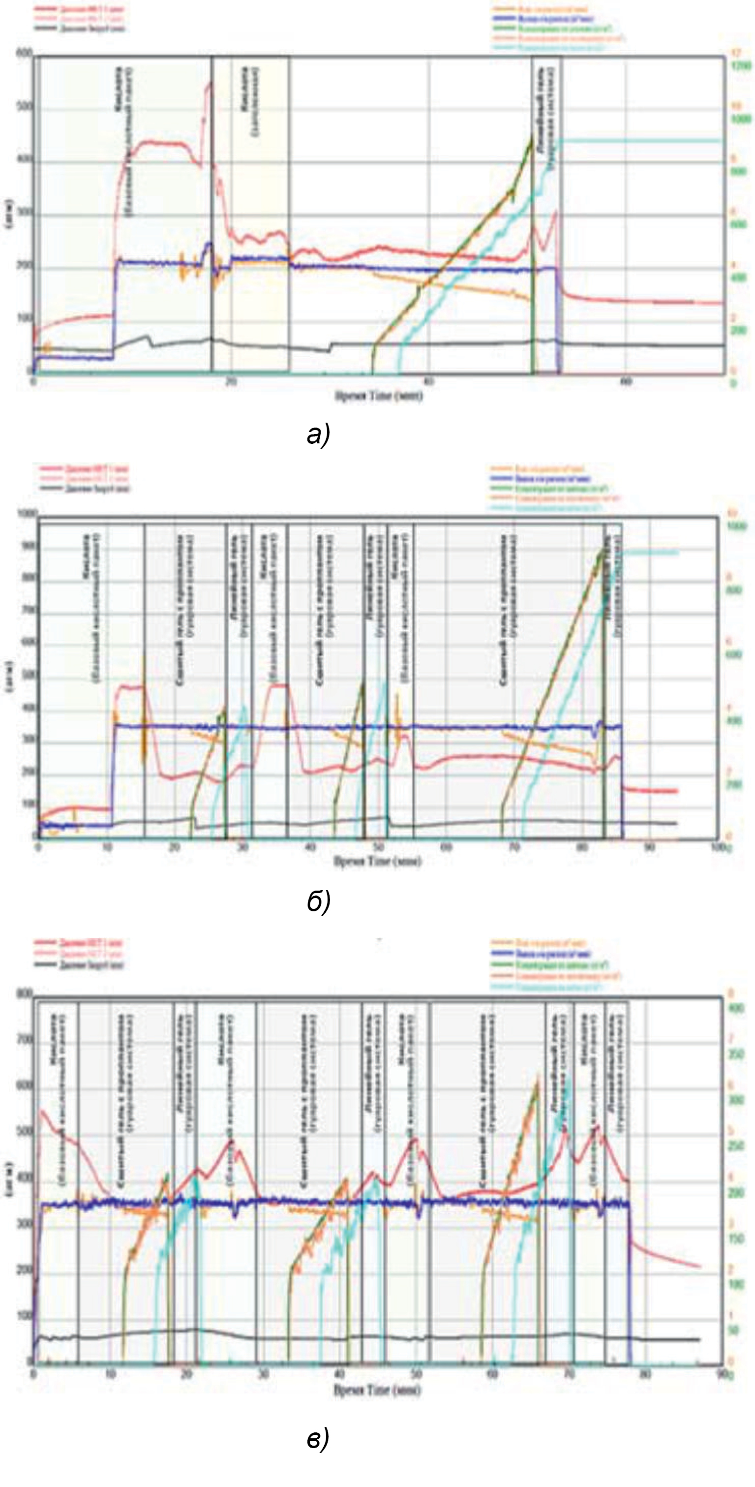 а) закачка комбинации базового кислотного пакета, загеленной кислоты и стандартного проппантного ГРП / injection of a mixture of basic acid pack, gelled acid and standard proppant fracturing; б) закачка кпГРП с закреплением ПЗП проппантной пачкой / injection of acid-proppant fracturing with proppant pack fixing well bottom zone; в) закачка кпГРП без закрепления ПЗП проппантной пачкой / injection of acid-proppant fracturing with proppant pack fixing well bottom zone