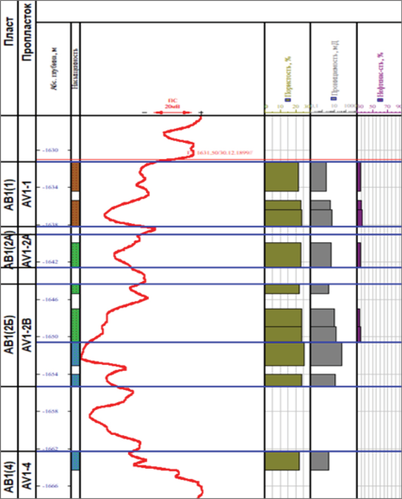 Одним из важнейших факторов риска при планировании разработки является наличие нижележащего водонасыщенного пласта АВ1(4) общей толщиной 5–10 м, расположенного на расстоянии 15–20 м ниже пласта АВ1(1–2). На рис. 1 представлен типовой литологический разрез пласта.