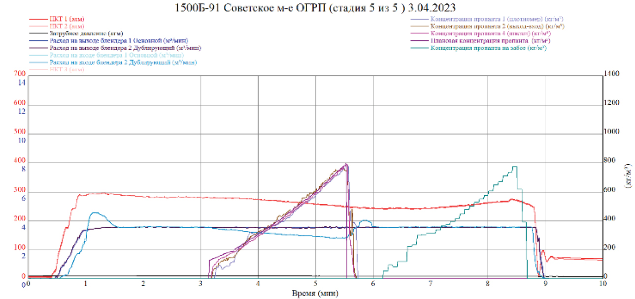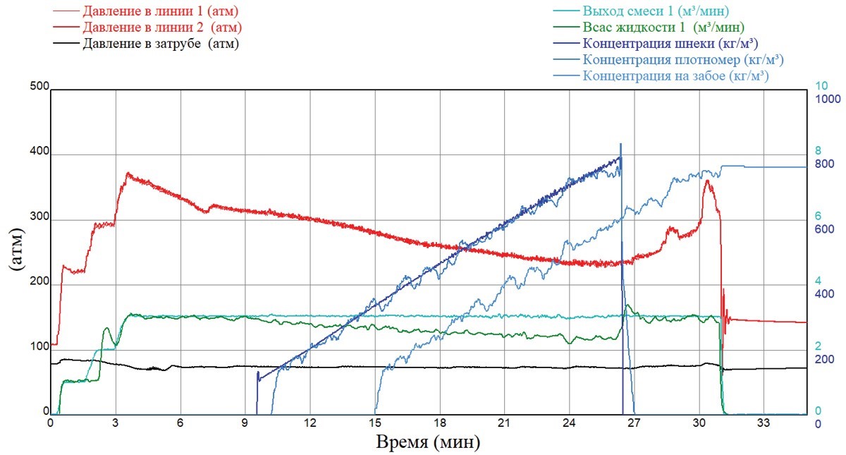 На момент написания статьи и подготовки материалов опыт работ с системой BPS™ на линейном геле в условиях рассматриваемого объекта месторождений группы компаний «Газпром нефть» составил более 40 скважин МГРП с 5–7-стадийным заканчиванием. Работы проводились на пластах группы АВ на глубинах до 1700 м по вертикали. Масса проппанта составляла от 3 до 5 т при максимальной концентрации 800 кг/м³. Для обработок использовали проппант фракций 20/40 и 16/20, с концентрацией полимера от 2,8 до 3,2 кг/м³. Средняя скорость закачки составляла 2–3 м³/мин. Пример графика закачки представлен на рис. 12. Среднее время выполнения операций с учётом работы КРС составило 17 ч. Подтверждена возможность нормализации забоя при получении «СТОП» силами бригад КРС и ГРП без остановки работ и привлечения дополнительного оборудования.