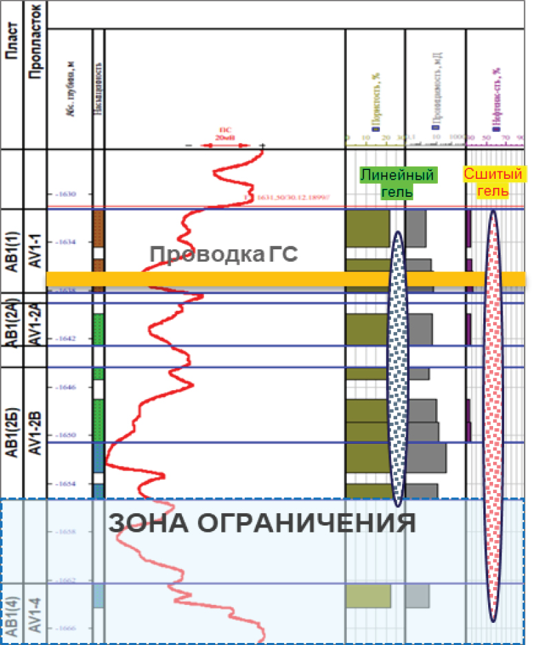 В рассматриваемом материале основной акцент сделан на работу с объектами, где существует высокий риск прорыва трещины ГРП в водонасыщенные интервалы, а также на решения, направленные на минимизацию этих рисков. В группе компаний «Газпром нефть» к таким объектам относятся пласты АВ1(1–2), разработка которых стандартными методами интенсификации ведет к значительному обводнению продукции и потере рентабельности строительства скважин. Интенсификация данного объекта осложнена наличием нижележащего обводнённого пласта АВ1(4). Стандартный подход строительства горизонтальных скважин (далее – ГС) с шаровыми компоновками и ГРП на сшитых системах даёт высокую обводнённость продукции (до 90%).