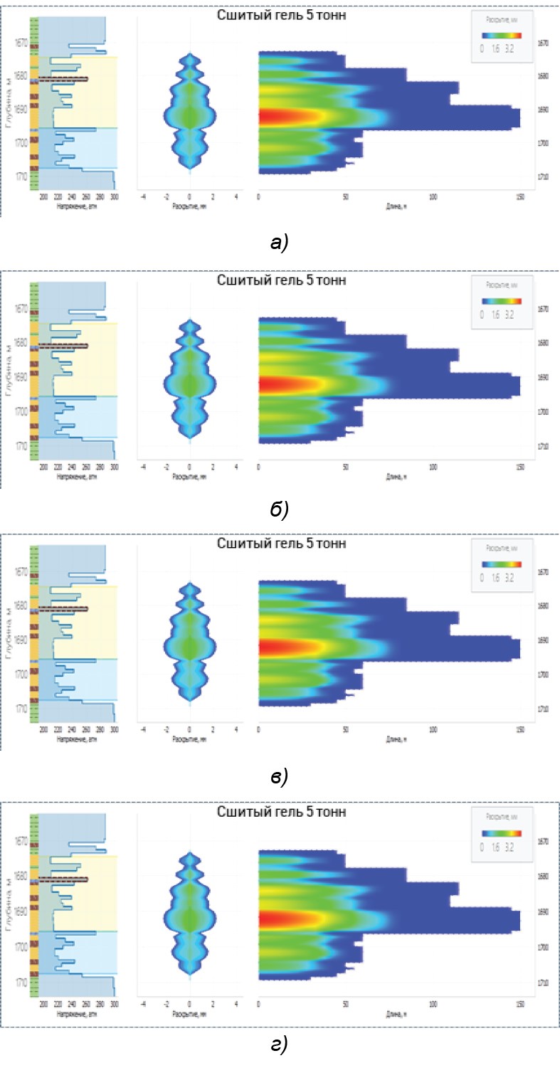 Дизайн на сшитом геле показывает приобщение и закрепление трещины по всей мощности пласта, с подключением нижележащего водонасыщенного объекта. Дизайны на линейном геле показывают преимущественное расположение закреплённой трещины в интервалах интереса с наименьшим приобщением водонасыщенных пропластков и сохранением эффективной закреплённой полудлины трещины. В результате обеспечивается более эффективная разработка пласта.