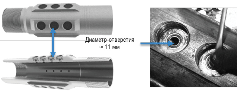 В группе компаний «Газпром нефть» была применена система, получившая название BPS™ (англ. Burst Port System – система разрывных портов). Система спускается в скважину на НКТ с диаметром 114 или 102 мм, с герметично закрытыми муфтами, оборудованными предварительно фрезерованными и загерметизированными отверстиями, с настройкой на определенное давление активации. Применяются различные типы муфт для обсаженных стволов [7] (рис. 8–9).