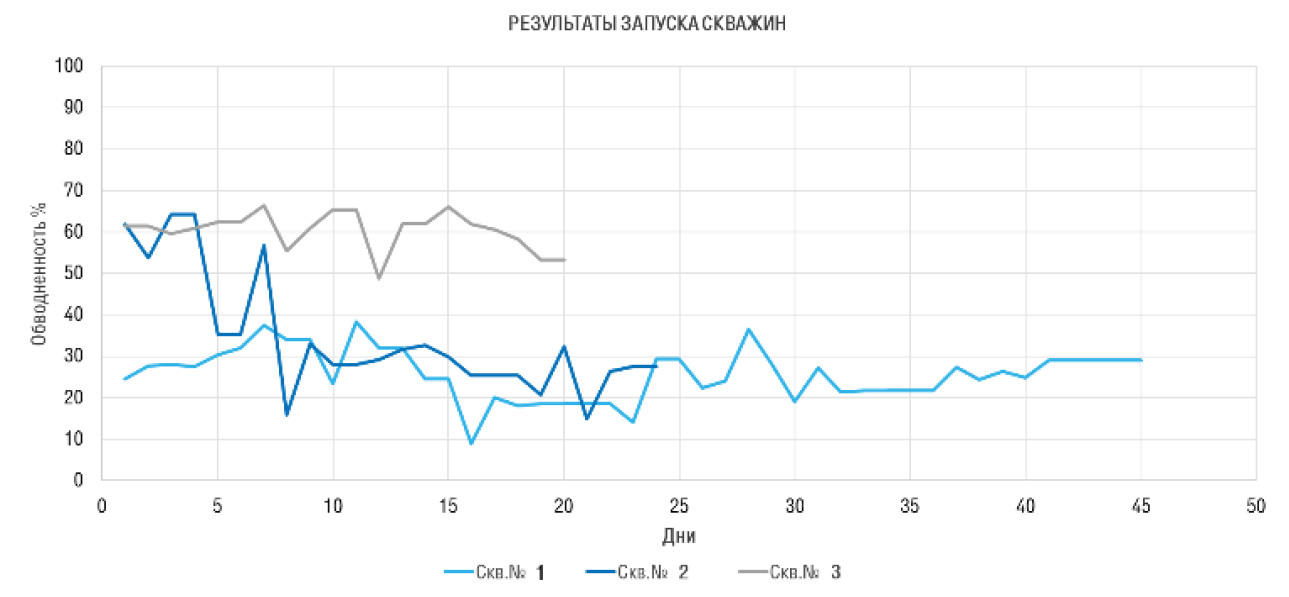 Для снижения рисков и исключения прорыва трещины в обводнённый пласт был разработан и внедрён специальный технологический подход, включающий в себя изменение конструкции заканчивания и смену концепции ГРП с переходом от высоковязких систем к маловязким жидкостям (линейный гель). В настоящее время ГРП по изменённой технологии был проведён более чем на 40 ГС. В результате была достигнута средняя обводнённость продукции в 40%, а также зафиксирована более высокая продуктивность скважин.