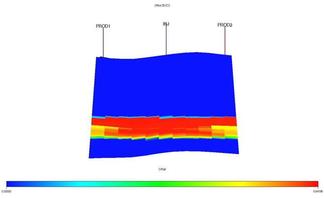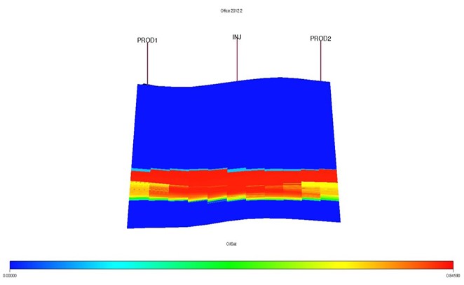 Размер секторной модели – 7 (X) × 11 (Y) ячеек, имеет 1850 слоев по вертикали (Z). Средний размер ячеек равен 150 x 150 x 0,83 м. Размер модели равен 1050 x 1650 x 1040 м. Пласты I и II разделены непроницаемым слоем глины. Между II и III пластами на участке сектора отсутствует глинистые разделы. Рассматриваемый пласт состоит из 350 ячеек по вертикали, занимающих в модели слои с 1380-го по 1730-й. В модели также присутствуют две добывающие (PROD1 и PROD2) и одна нагнетательная (INJ) скважина, расположенная на расстоянии 700 м от добывающих. Скважины расположены на расстоянии 700 м между добывающими и нагнетательной скважинами.
