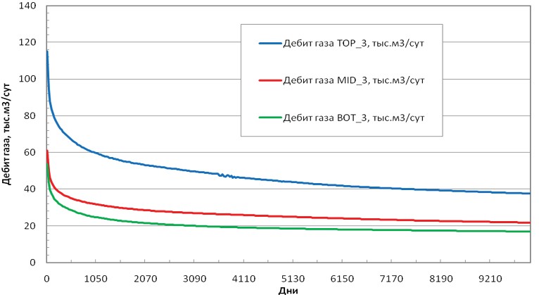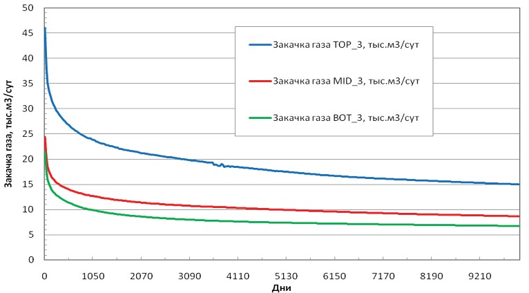 В случае перфорации в верхней части III пласта видно, как добыча из соседних ячеек снижает давление в зоне ГНК, что позволяет газу газовой шапки, расширяясь в сторону III пласта, двигаться к добывающим скважинам. Большие объёмы добычи приводят к большим объёмам закачиваемого газа. Вариант ТОР_3 значительно выделяется по показателям добычи газа, жидких углеводородов и закачке газа, что говорит о прямой зависимости между объёмами закачиваемого газа и объёмами добычи ЖУ. Основным отличием варианта ТОР_3 является «смешивающийся поток» закачиваемого газа и ЖУ, вызванный перфорацией в зоне ГНК, в сравнении с «поршневым» вытеснением вариантов МID_3 и BOT_3. Для организации подобного смешивающегося потока рекомендуется применять перфорацию, типичную для варианта ТОР_3, и увеличение объёмов закачки, что было использовано при расчётах модифицированных вариантов, рассматриваемых в настоящей работе.