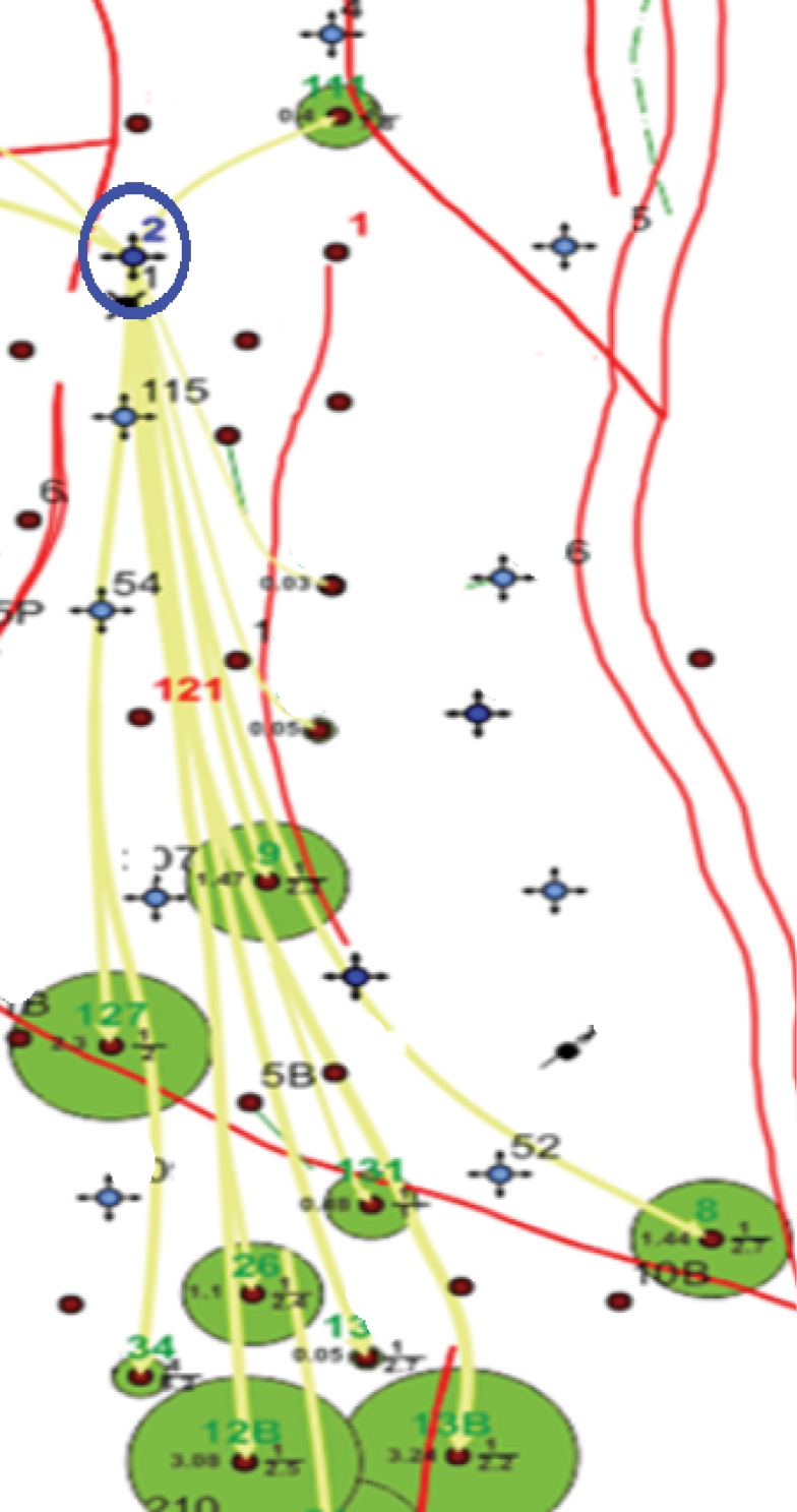 Рисунок 8. Схема основных трасс перемещения индикатора со скважины 2