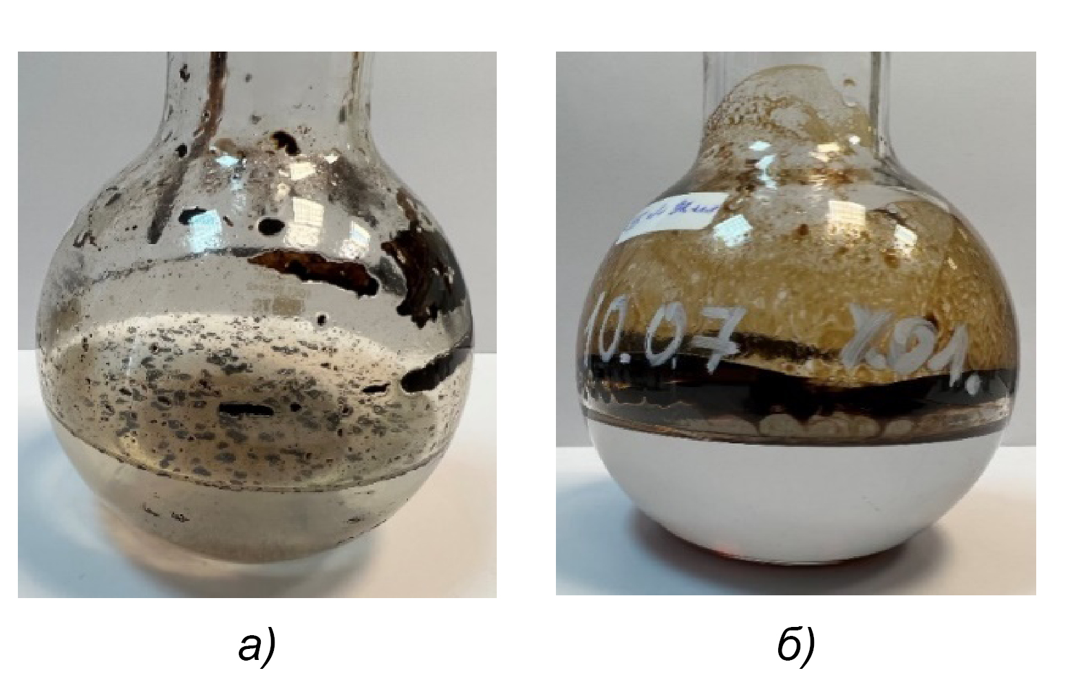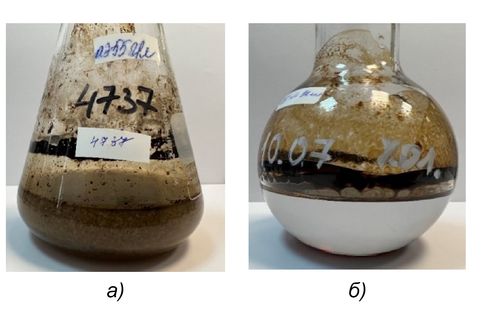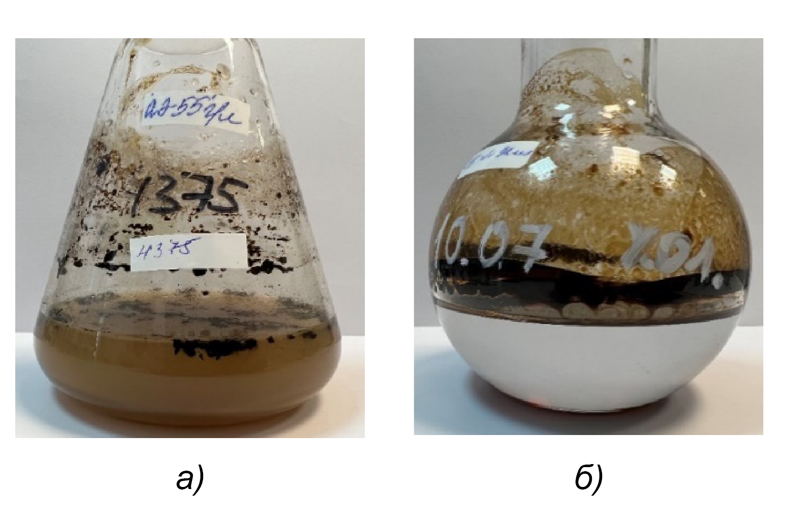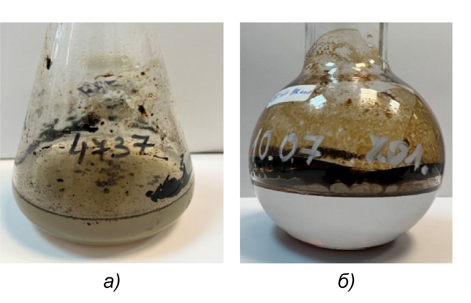 Накопительная культура 4737, полученная на питательной среде с минерализацией 20 г/л, визуально оказывала наиболее значительное влияние на нефть: наблюдали изменение консистенции внесенной нефти, которая хорошо смывалась со стенок, наблюдалось образование мелкодисперсной фракции нефти и остатков неокисленной нефти (рис. 1).