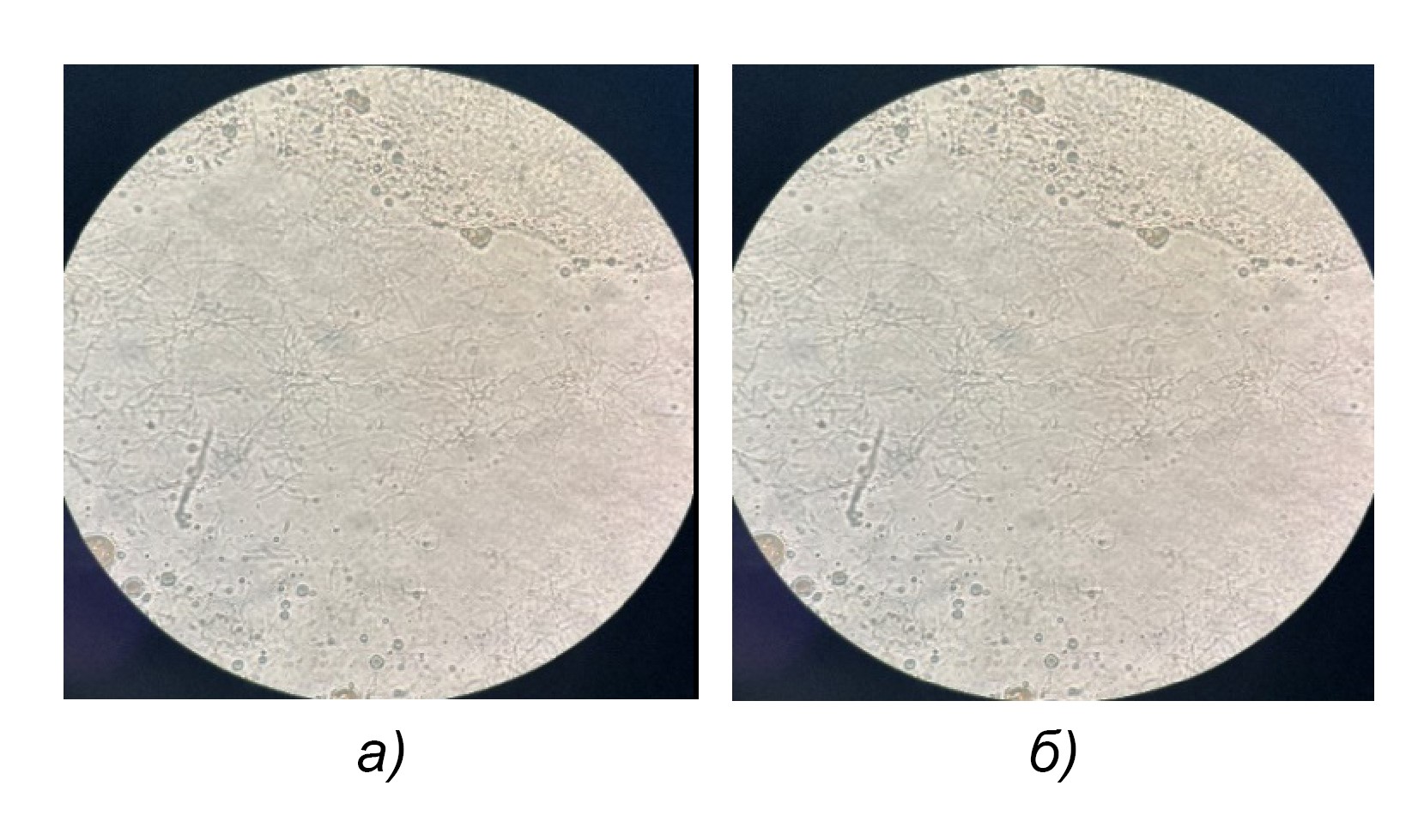 Через 12 сут произвели пересев наиболее активных накопительных культур на свежие жидкие питательные среды. На тринадцатые сутки провели микроскопирование образцов грунта.