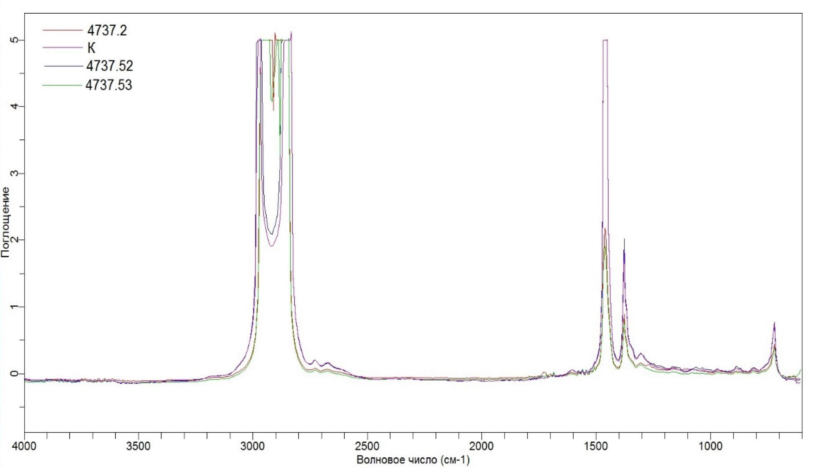 Рисунок 6. ИК-спектры нефти месторождения Узень, экстрагированной из накопительных культур 4737/2, 4737/52 и 4737/53