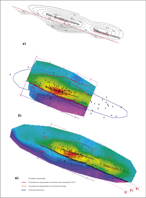 Согласно более ранним исследованиям, Южно-Жетыбайская структура по подошве анизийского яруса представляла собой относительно простое антиклинальное поднятие протяжённостью около 12 км и шириной около 2 км, с амплитудой около 400 м (рис. 2, а). Однако по результатам 3D сейсмической съёмки, выполненной в 2019 г., была существенно уточнена структурная поверхность подошвы анизийских отложений. Новые данные позволили выделить ряд взбросовых нарушений, ранее не фиксировавшихся, что в целом изменило представления о тектоническом строении горизонта.