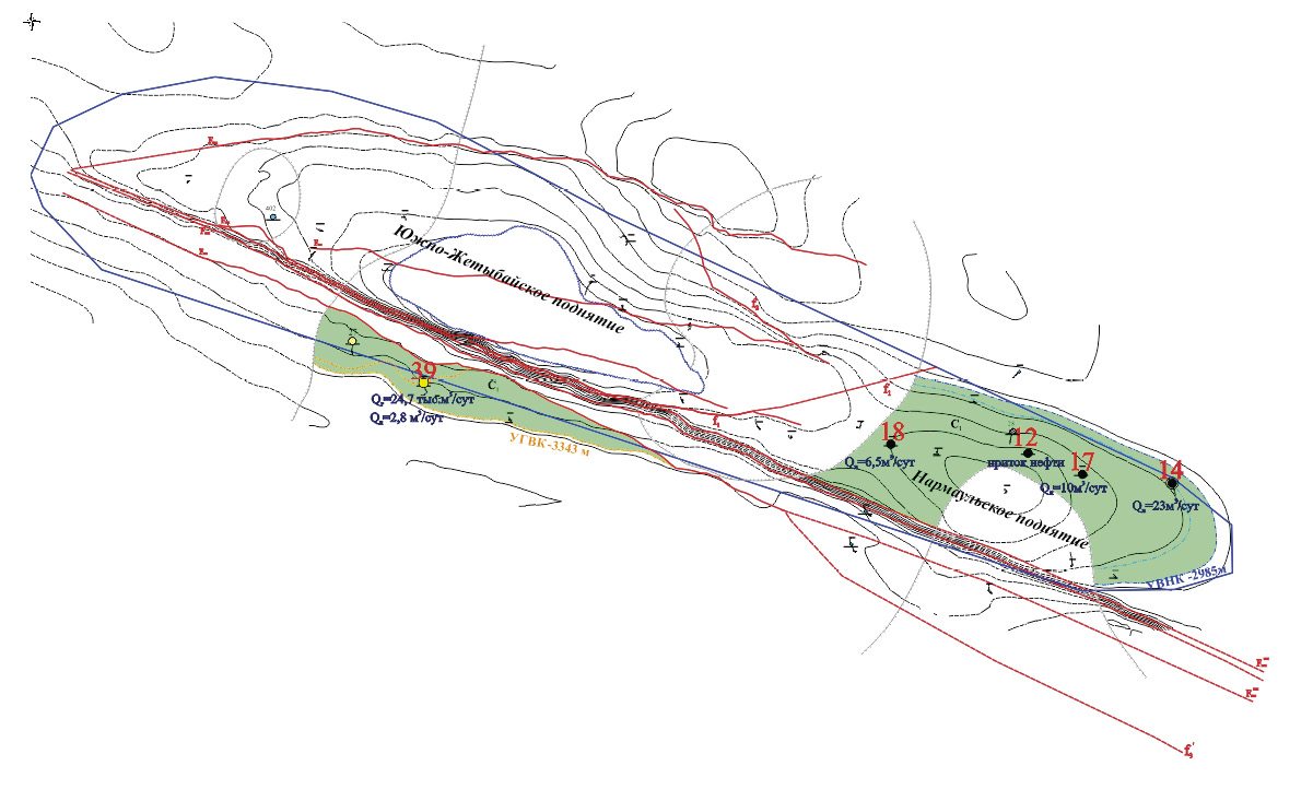 По данным сейсмической интерпретации, нарушение F1 располагается в центральной части Южно-Жетыбайского поднятия и простирается параллельно разлому F2, имея амплитуду около 300 м. На западном фланге расстояние между ними сокращается, что указывает на сжатие структуры. Нарушение F3 представлено в виде высокоамплитудного разлома, ограничивающего продуктивную зону в южной части поднятия.