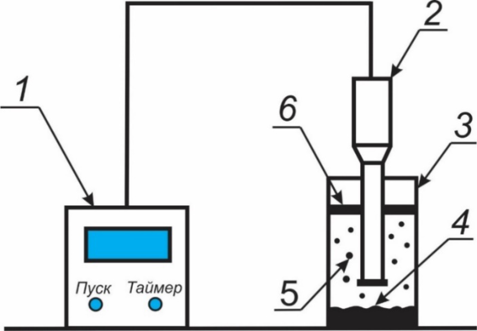 1 – ультрадыбыстық генератор / ultrasonic generator; 2 – толқын шығарғыш / waveguide; 3 – химиялық стакан / chemical beaker; 4 – мұнайбитумды жыныс / bituminous rocks; 5 – көтеріліп жатқан битум тамшылары / rising bitumen drops; 6 – битум қабаты / bitumen layer