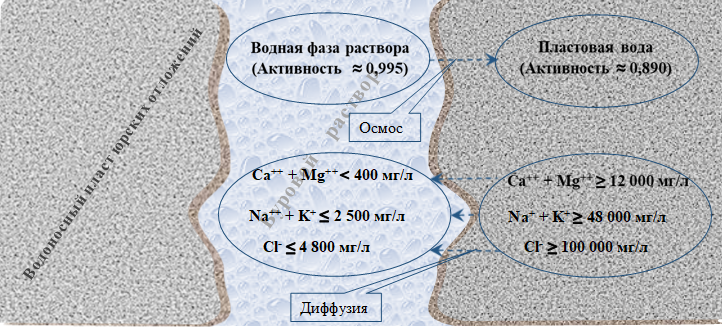 Рисунок 1. Схема диффузионного и осмотического массопереносов между дисперсионной средой типового бурового раствора, применяемого на месторождениях Узень и Карамандыбас, и пластовыми водами юрских отложений этих месторождений