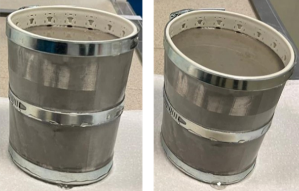 Была создана трёхслойная модель участка открытого ствола скважины, пробуренного в проницаемом водонасыщенном пласте. Каркас модели составлял пластиковый стакан диаметром 85 мм и высотой 110 мм, образующая (боковая стенка) которого была густо перфорирована сквозными отверстиями диаметром от 1 до 3 мм. Наружная боковая поверхность по всему периметру стакана обтягивалась плотной фильтровальной бумагой, а поверх неё – мелкой металлической сеткой размером ячеек 200 меш. Затем эта трёхслойная конструкция для её прочности и плотности контакта между слоями была стянута в верхней, средней и нижней частях тремя металлическими кольцевыми хомутами. Торцы нижних границ боковой стенки стакана, фильтровальной бумаги и металлической сетки были герметизированы силиконом с целью недопущения протечек и прямого контакта между образцом бурового раствора и моделью пластовой воды.
