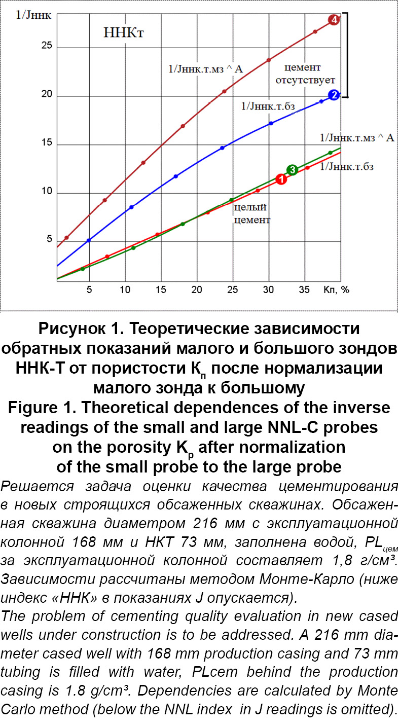На рис. 1 нормализованные кривые 1/Jмз.норм и 1/Jбз практически совпадают при целом цементе Cem = 100% (кривые 1 и 3) и существенно расходятся при полностью отсутствующем цементе Cem = 0 (2 и 4), а при частичном разрушении цемента расхождение пропорционально величине Cem. Из графиков можно также увидеть ещё одну важную особенность ННК-Ц: относительная разность кривых 2 и 4 приближённо постоянна и почти не зависит от Кп. Последнее позволяет ввести измеряемый функционал от показаний Si[Ji], равный относительной разности нормализованных обратных показаний двух зондов 2ННК (6), который пропорционален показателю разрушенности / некачественности цементного камня (1-Cem), не зависит или слабо зависит от Кп и Кг, меняется от 0 до 1 при изменении Cem от целого до отсутствующего. Константа К1 находится из расчётов Монте-Карло, она различна для разных приборов ММНК и ГТУ и готовится заранее.
