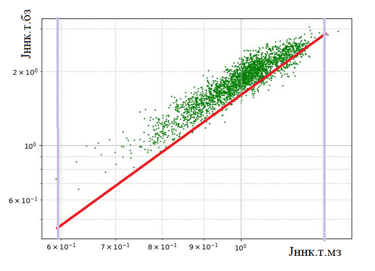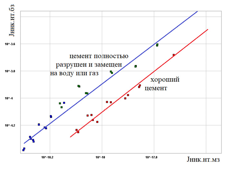 На рис. 2 приведён пример теоретического кросс-плота, рассчитанного методом Монте-Карло для зондов надтепловых нейтронов 2ННК-Нт прибора ряда ММНК, который построен в координатах «Jнт.мз – Jнт.бз» («скорость счёта малого зонда – скорость счёта большого зонда») в двойном логарифмическом масштабе. Данный кросс-плот демонстрирует, что точки, соответствующие хорошему цементу, находятся приближённо на одной прямой линии, которая описывается уравнением линейной регрессии в этих координатах (9):