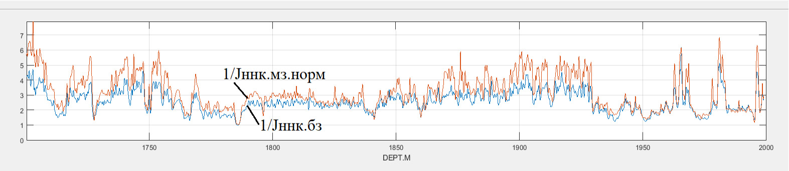 Пример эффективности этого преобразования приведен на рис. 1, где показаны зависимости обратных показаний малого (Jmz) и большого Jbz зондов ННК-Т от Кп после нормализации малого зонда к большому при решении задачи оценки качества цементирования в строящихся скважинах.